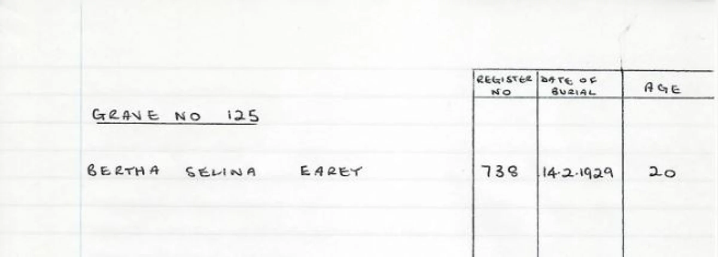 A handwritten record of the headstone for Grave 125 - Bertha Selina Earey in 1929.
