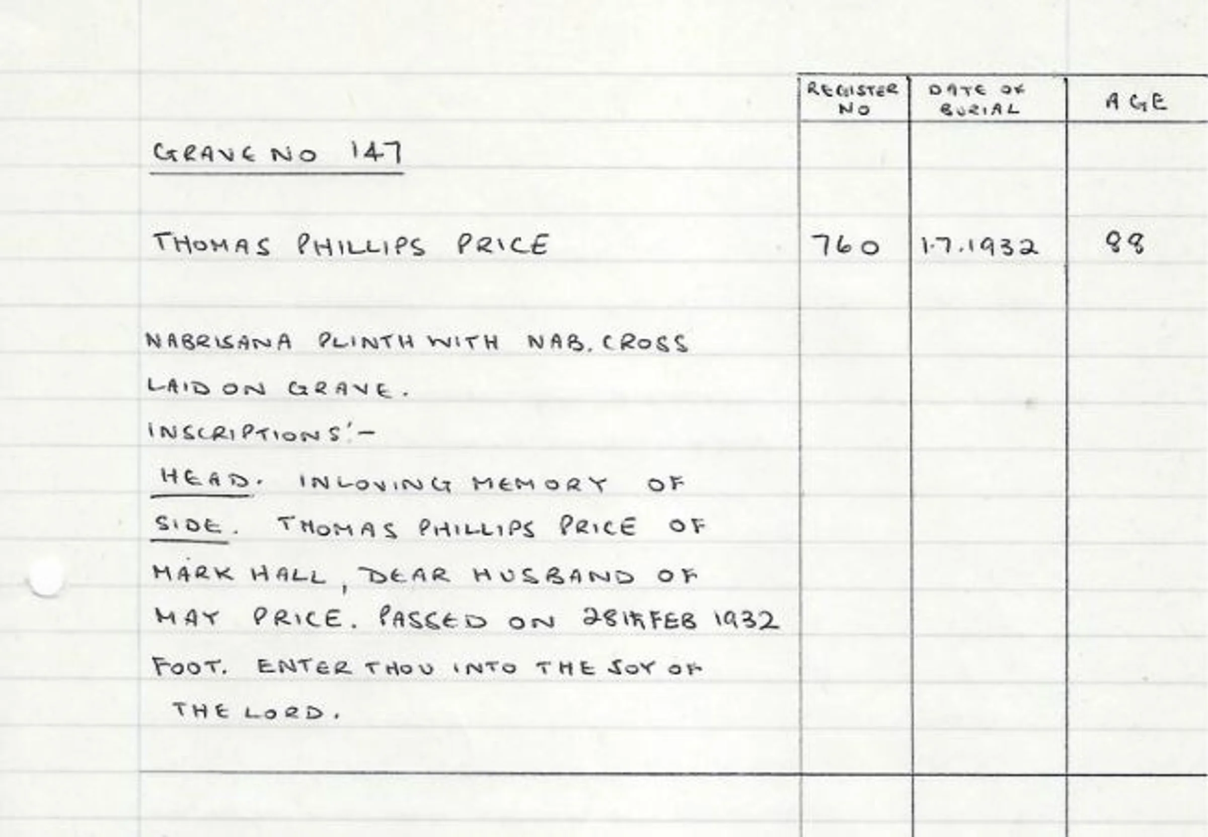 A handwritten record of the headstone for Grave 147, red area - Thomas Phillips Price in 1932.