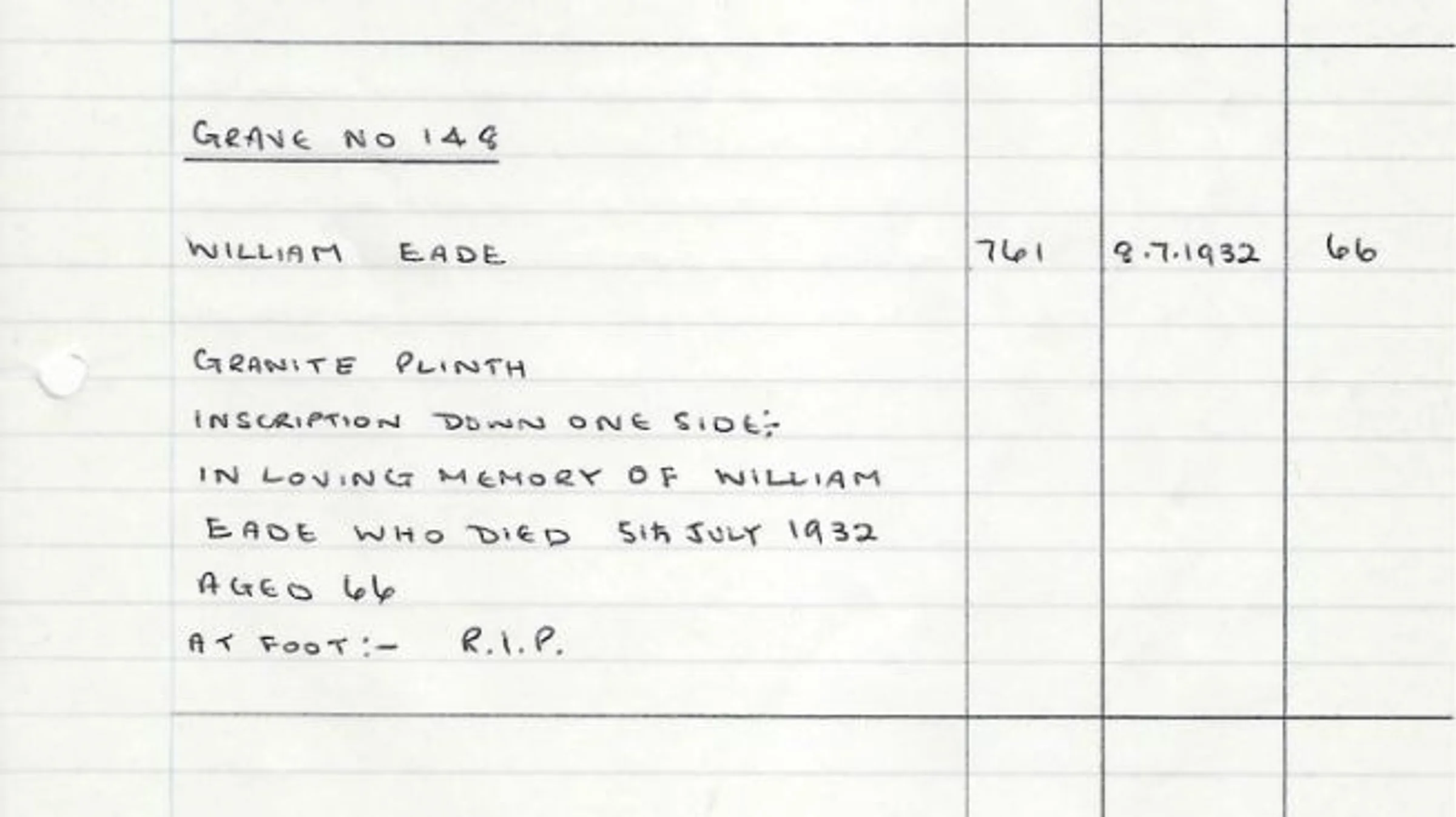 A handwritten record of the headstone for Grave 148, red area - William Eade in 1932.