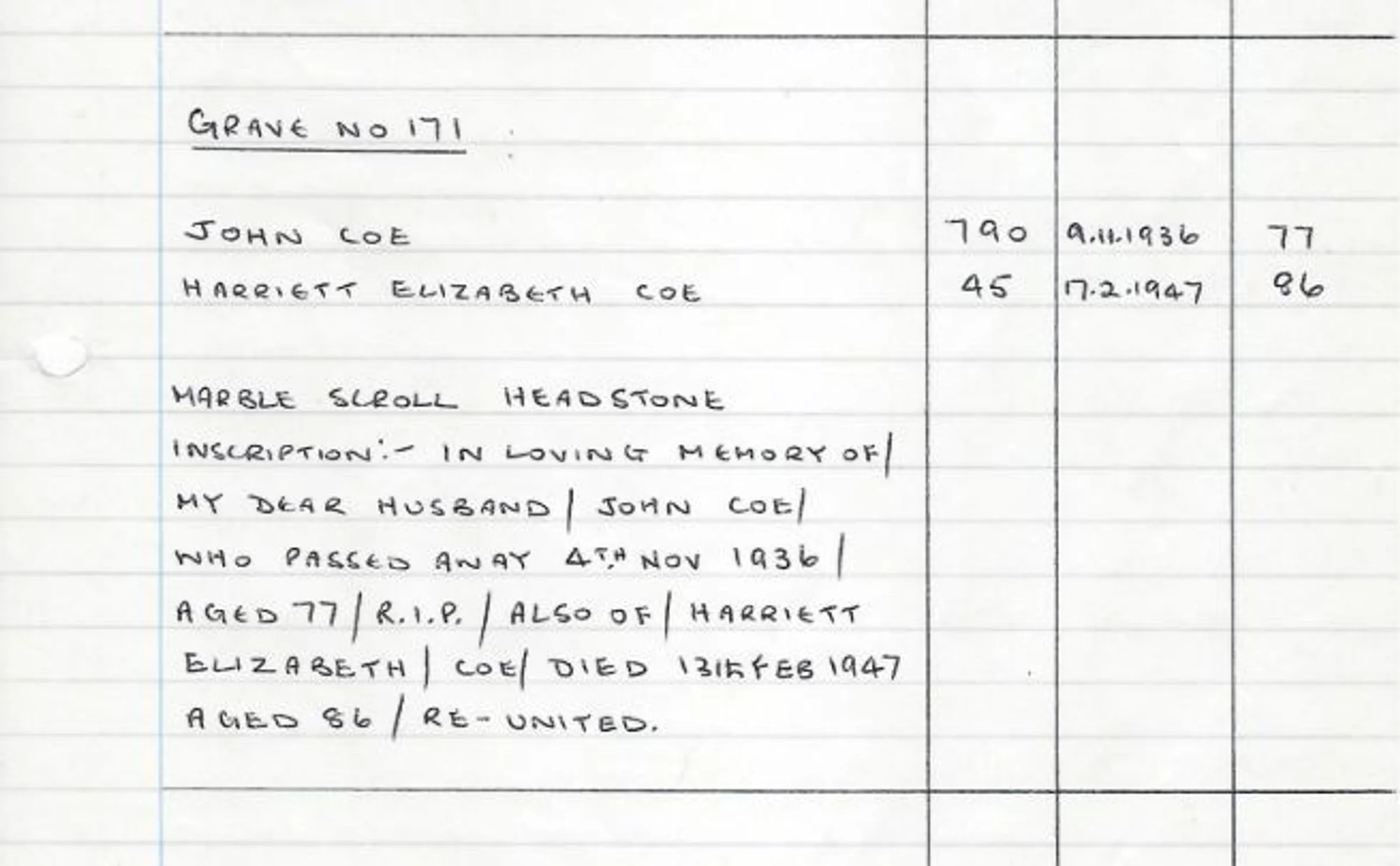 A handwritten record of the headstone for Grave 176, red area - Frederick Charles Godfrey in 1938 and his wife, Edith Jane Godfrey, in 1977. (The cremated remains of Phyllis Ethel Godfrey were added in 1992 and of Beatrice Mary Godfrey in 1996.)
