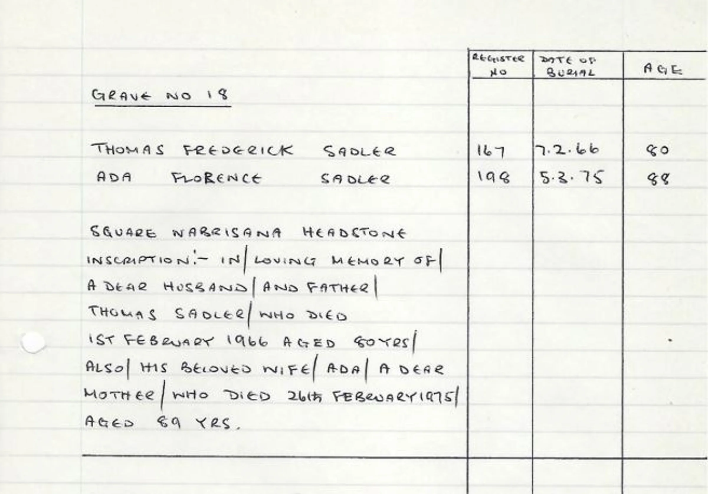A handwritten record of the headstone for Grave 18, blue area - Thomas Frederick Sadler in 1966 and his wife, Ada Florence Sadler in 1975.