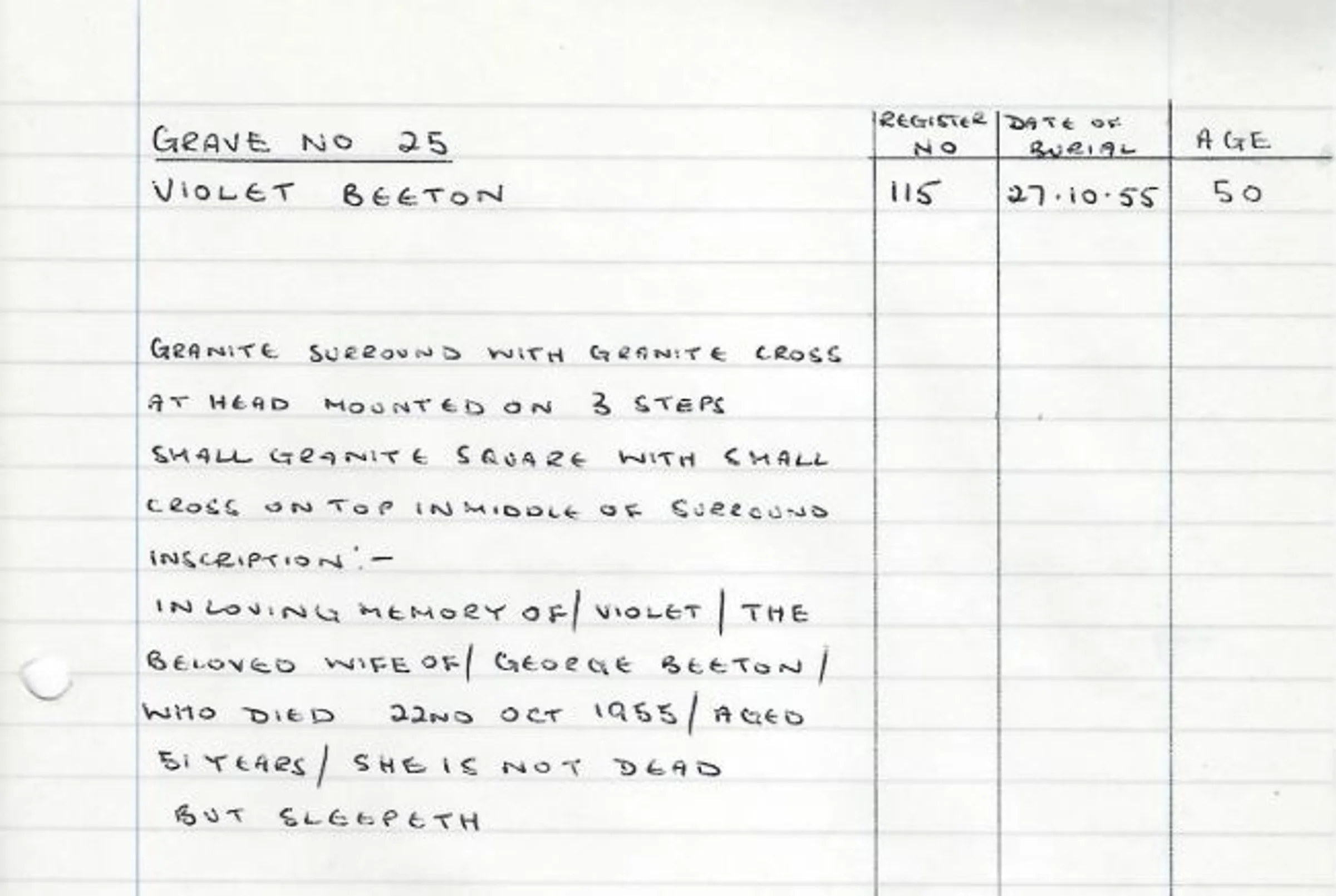 A handwritten record of the headstone for Grave 25, blue area - Violet Beeton in 1955.