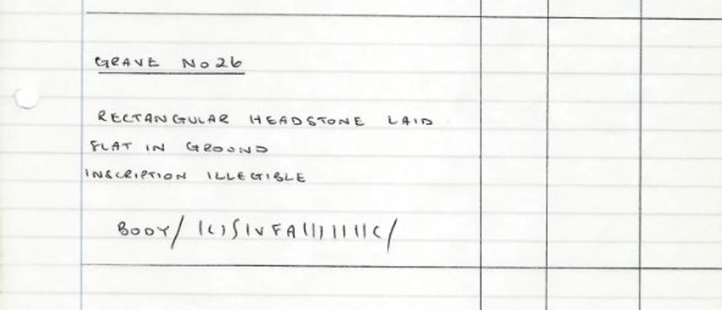 A handwritten record of the headstone for Grave 26 - which is a rectangular stone laid flat with an illegible inscription.