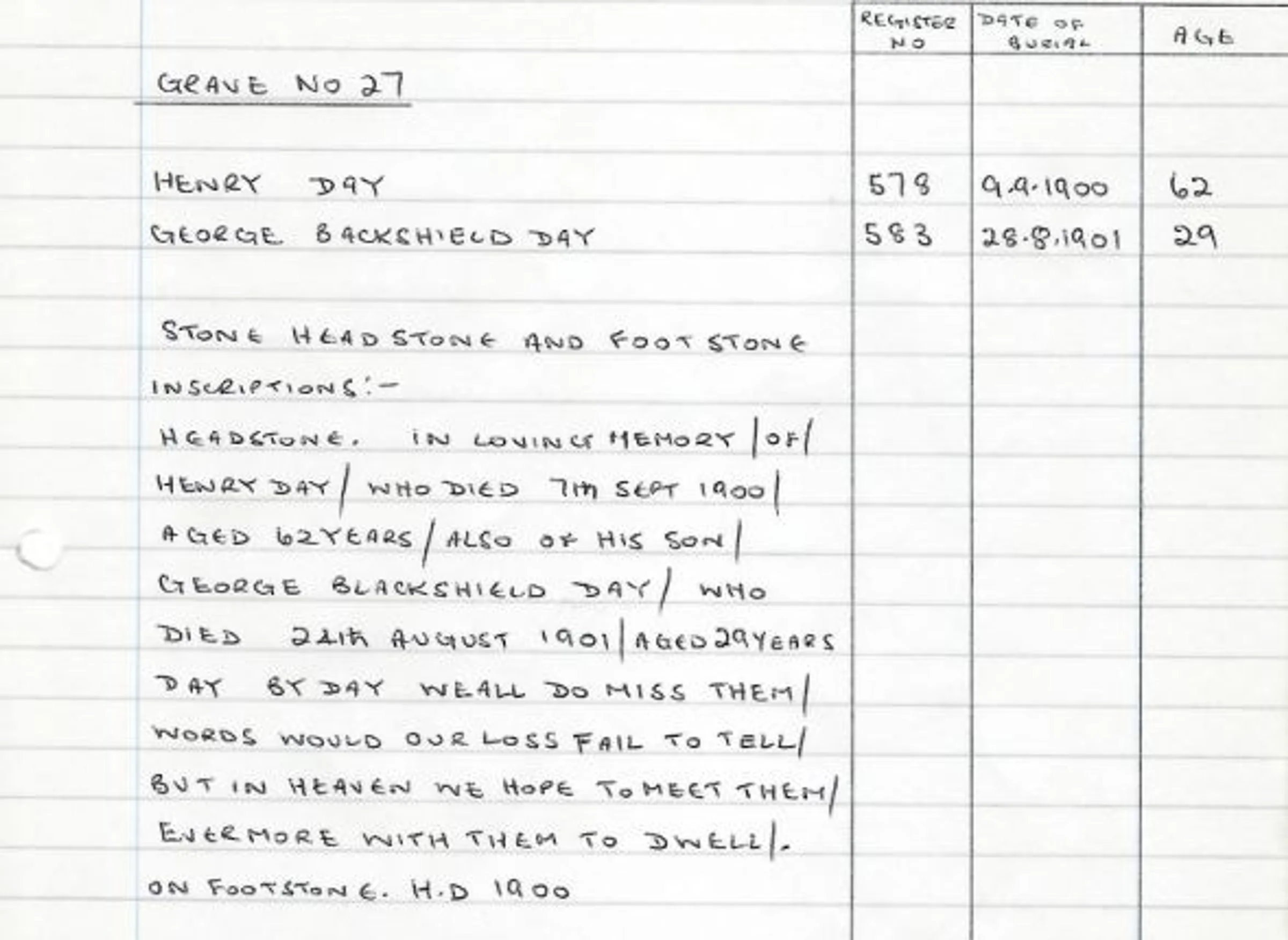 A handwritten record of the headstone for Grave 27 - Henry Day in 1900 and his son George Backshield Day in 1901.