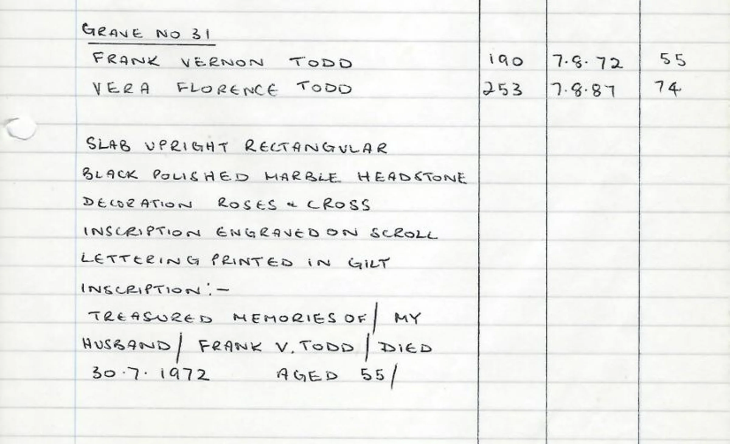 A handwritten record of the headstone for Grave 31, blue area - Frank Vernon Todd in 1972 and Vera Florence Todd in 1987.