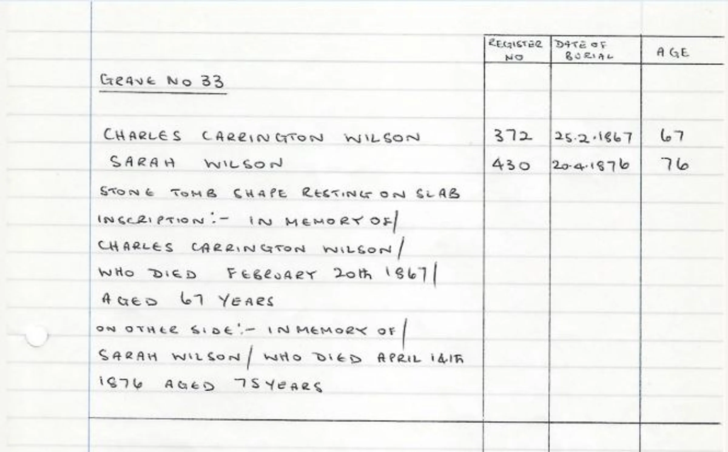 A handwritten record of the headstone for Grave 33 - Charles Carrington Wilson in 1867 and his wife, Sarah Wilson, in 1876.