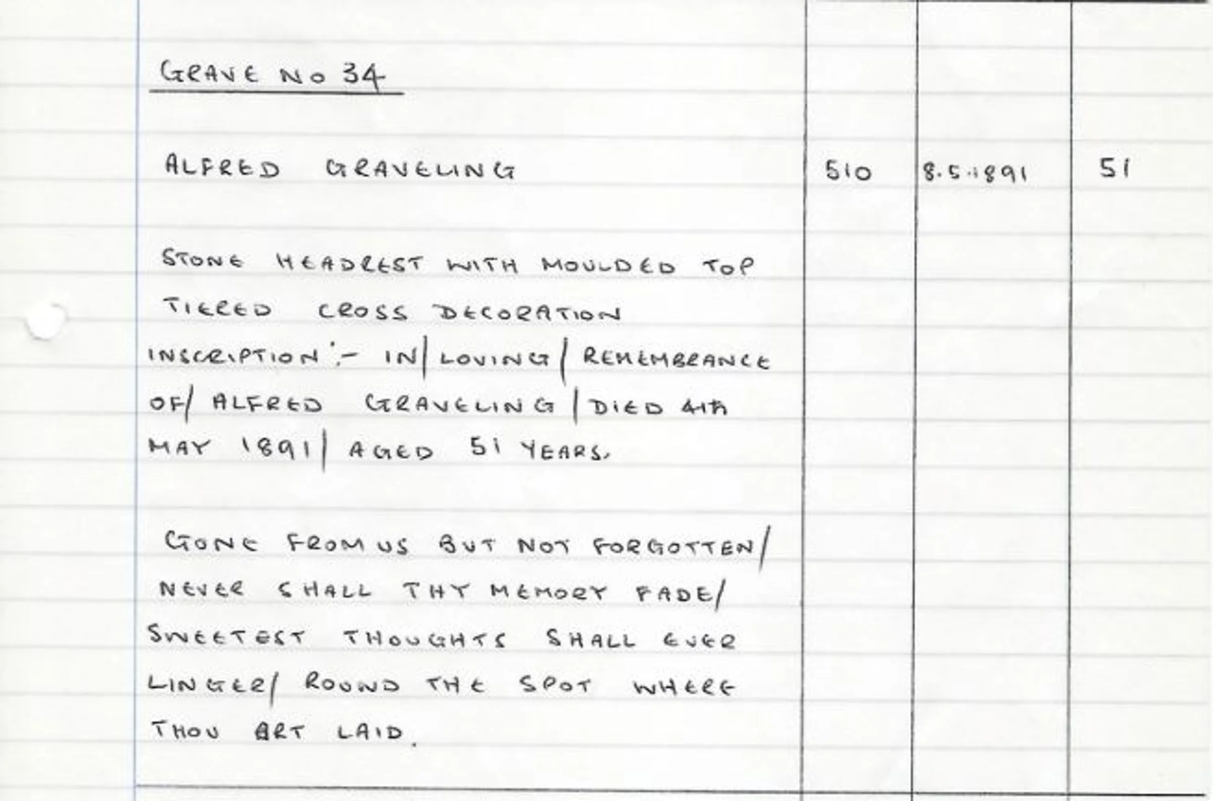 A handwritten record of the headstone for Grave 34 - Alfred Graveling in 1891.