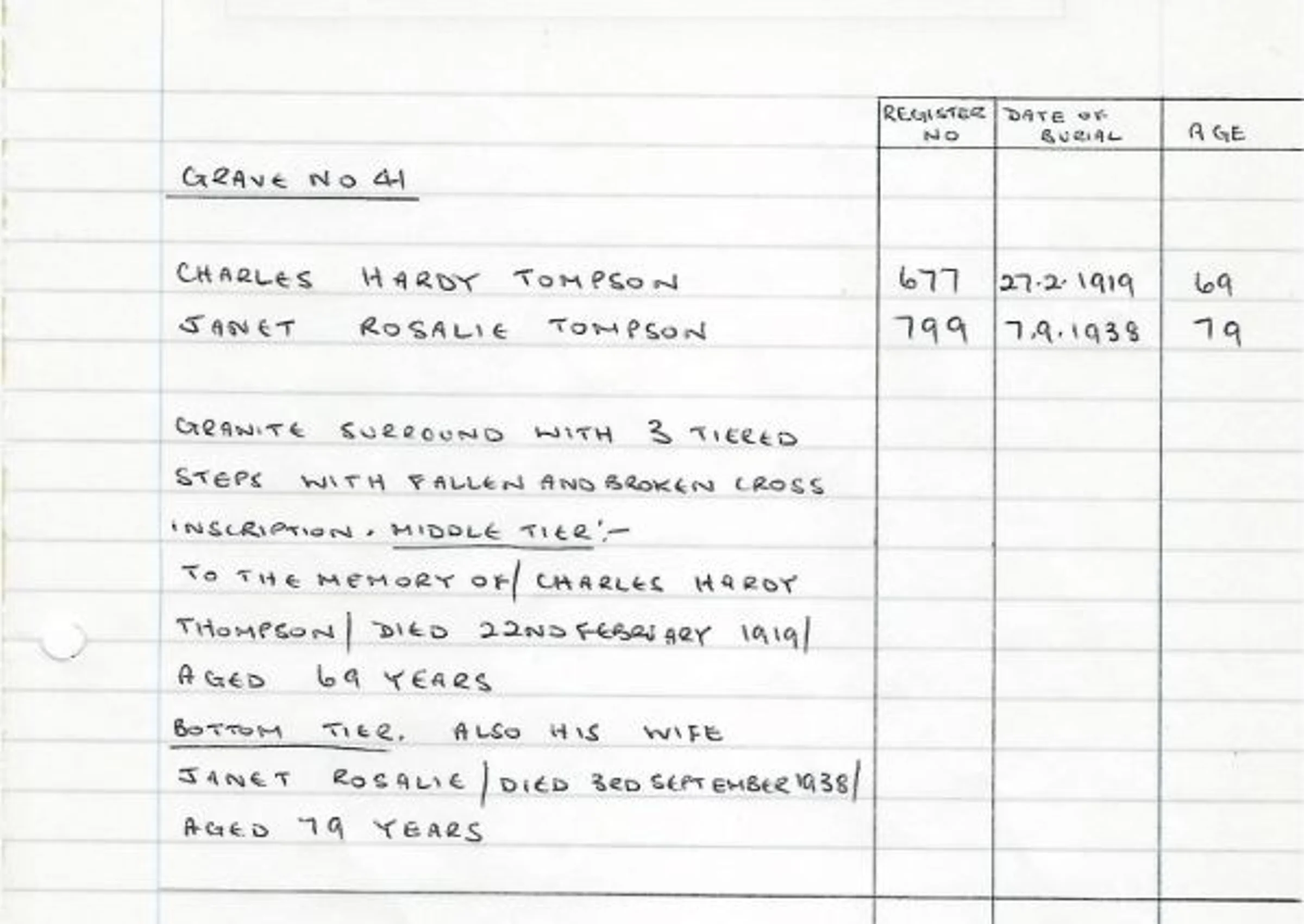 A handwritten record of the headstone for Grave 41 - Charles Hardy Tompson in 1919 and his wife, Janet Rosalie Tompson, in 1938.