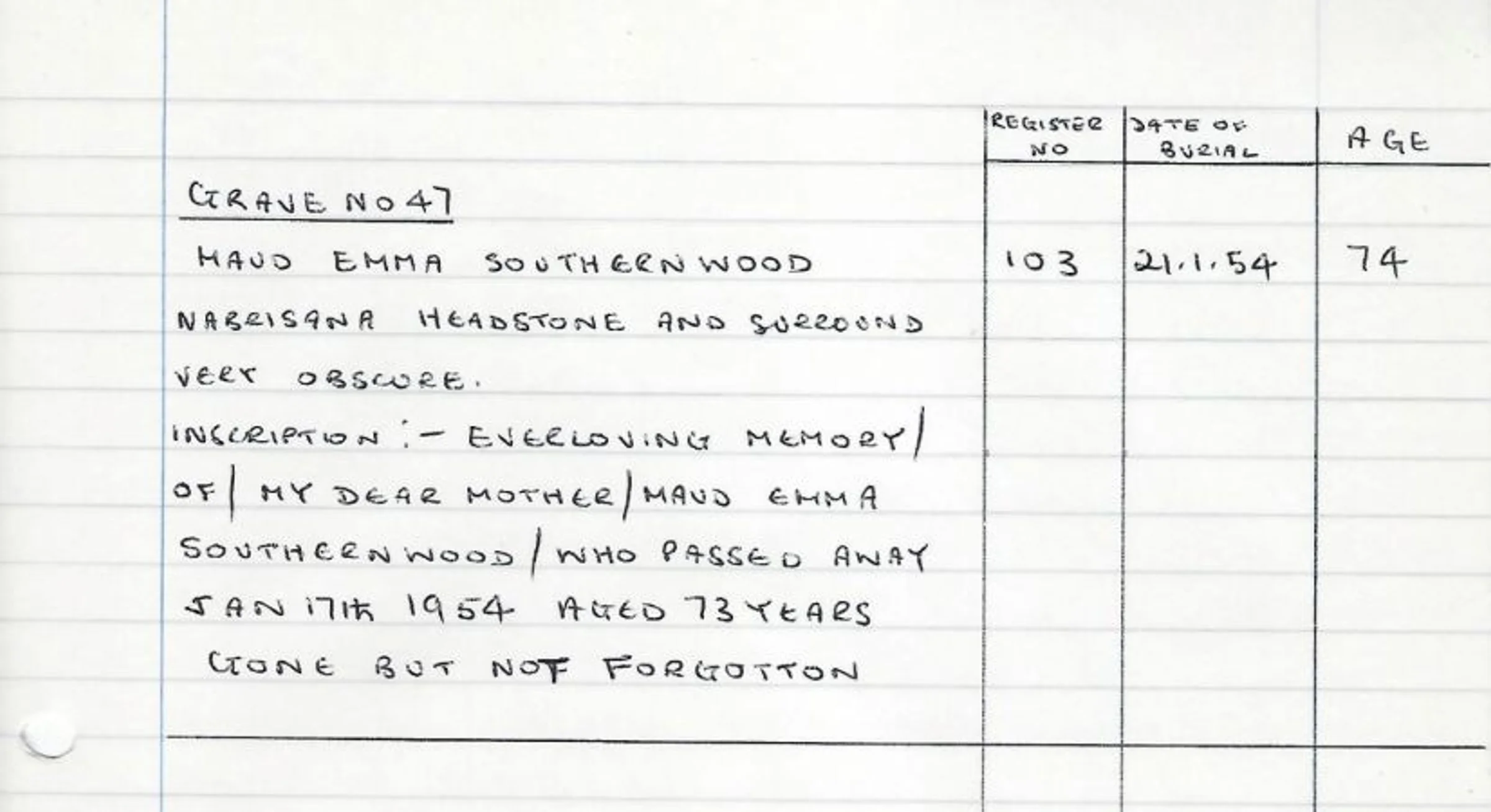 A handwritten record of the headstone for Grave 47, blue area - Maud Emma Southernwood in 1954.