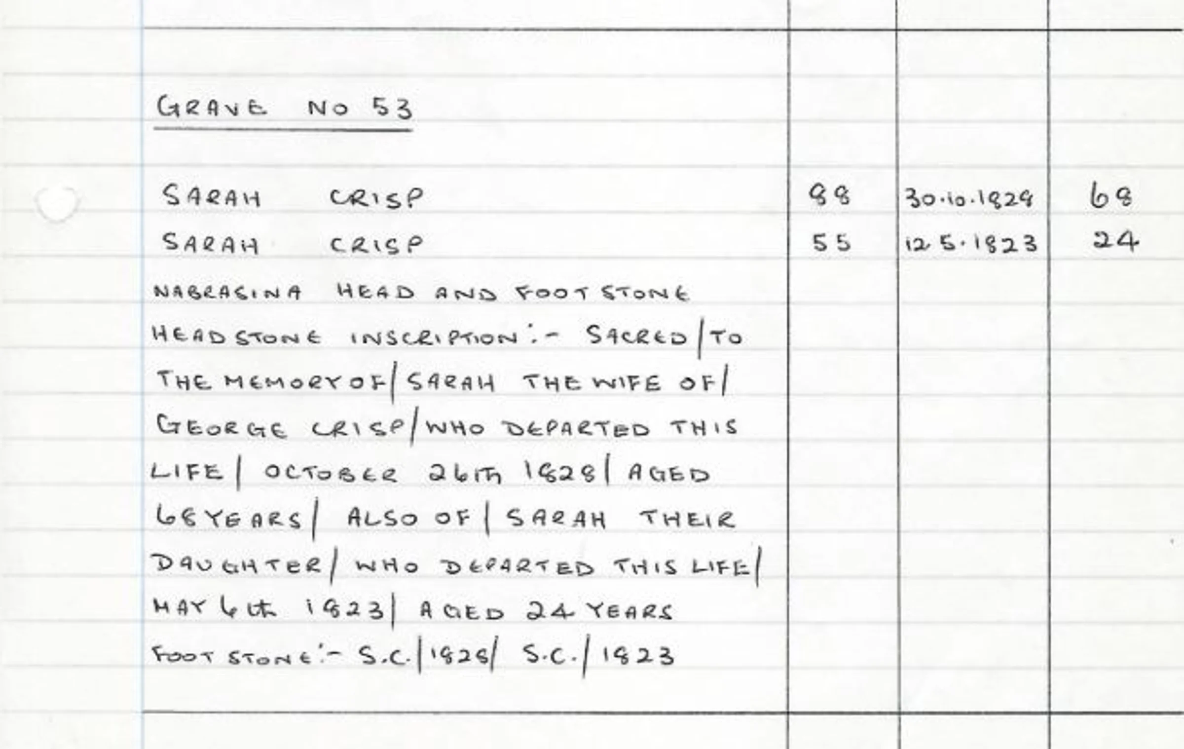 A handwritten record of the headstone for Grave 51 - Sarah Crisp in 1828 and her daughter, Sarah Crisp, in 1823.