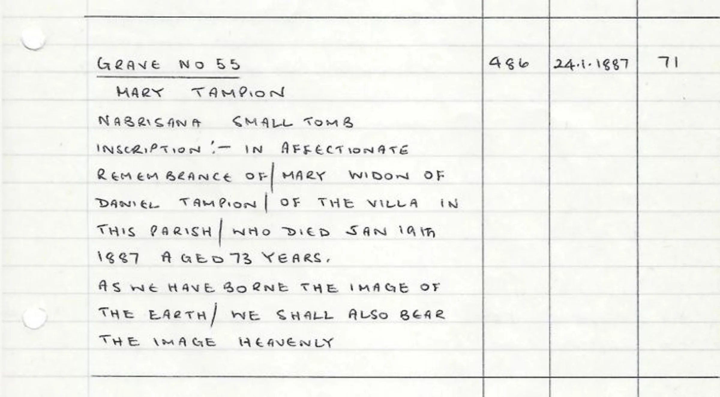 A handwritten record of the headstone for Grave 55 - Mary Tampion in 1887.