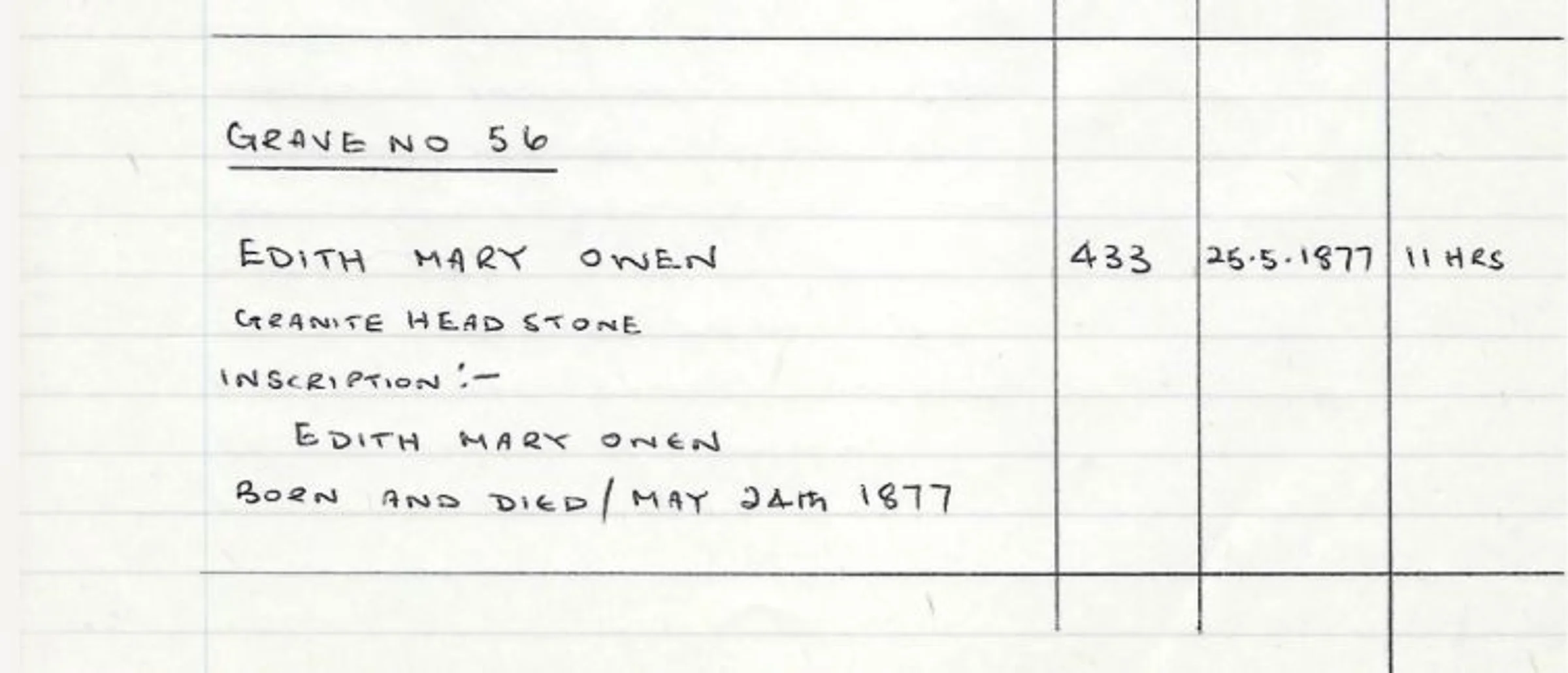 A handwritten record of the headstone for Grave 56 - Edith Mary Own in 1877.