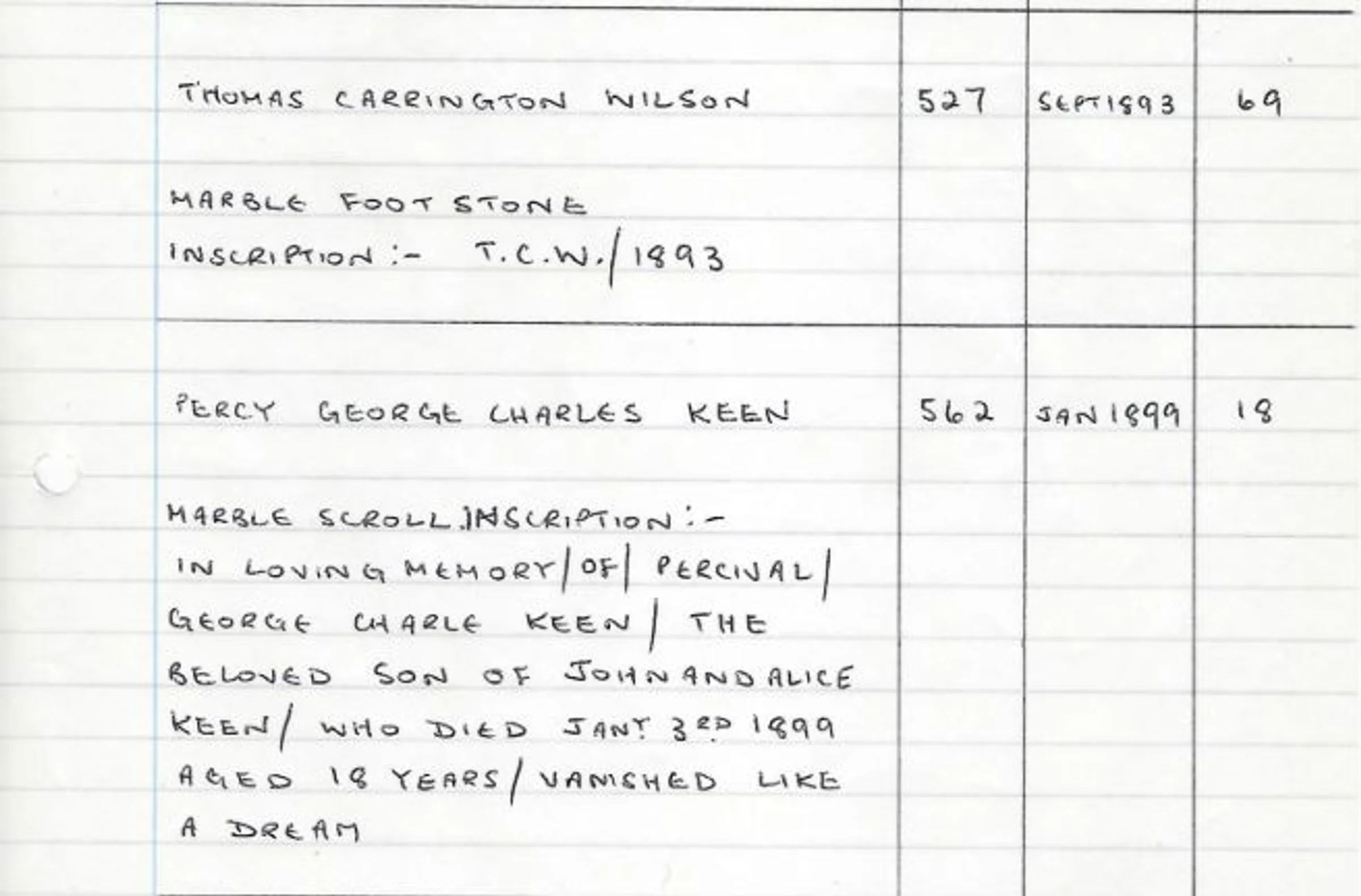 A handwritten record of the memorials for Grave 58 - Thomas Carrington Wilson in 1893 and Percy George Charles Keen in 1899. These memorials were removed to Grave 58 when the Church Hall was built along with others.
