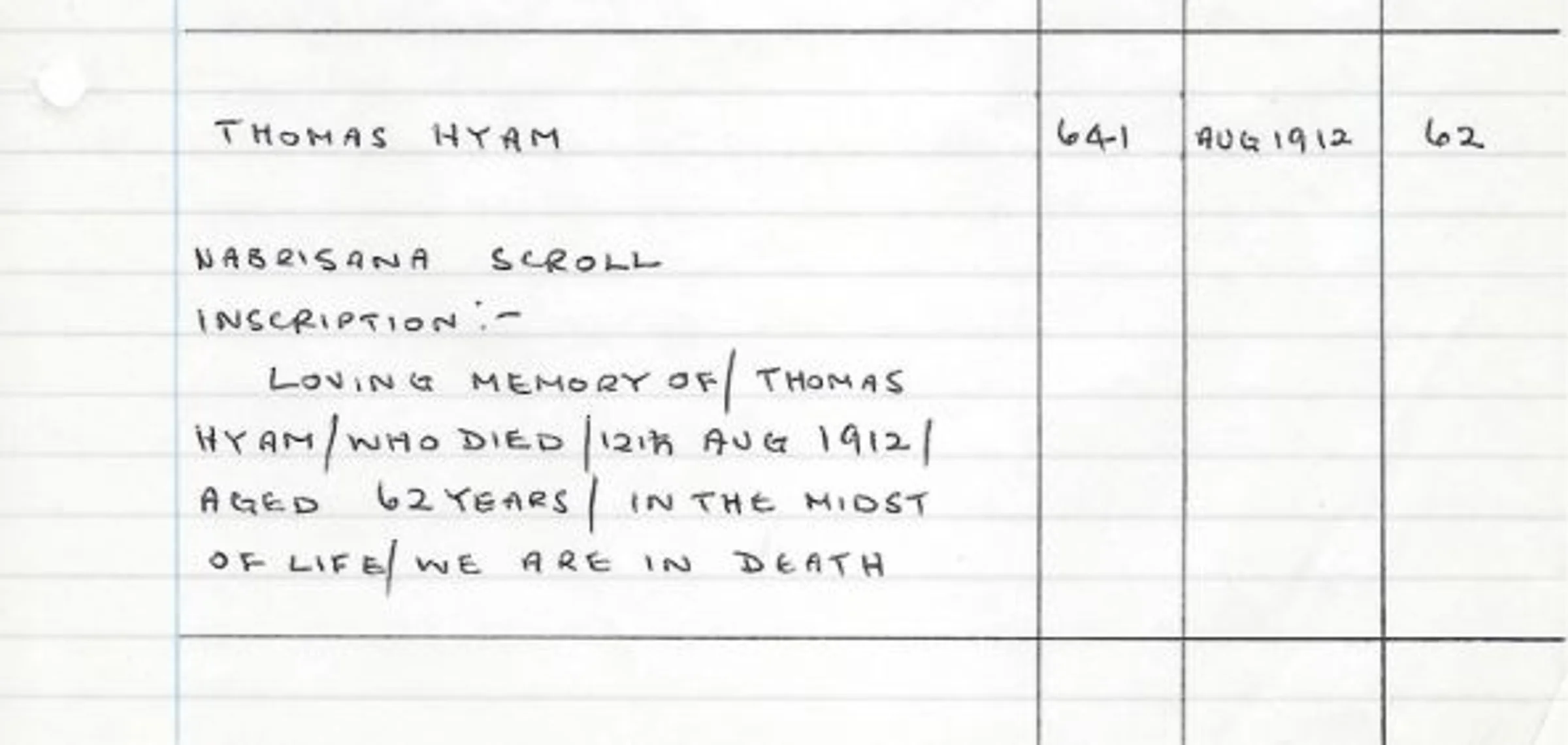 A handwritten record of the memorials for Grave 58 - Thomas Hyam in 1912. This memorial was removed to Grave 58 when the Church Hall was built along with others.