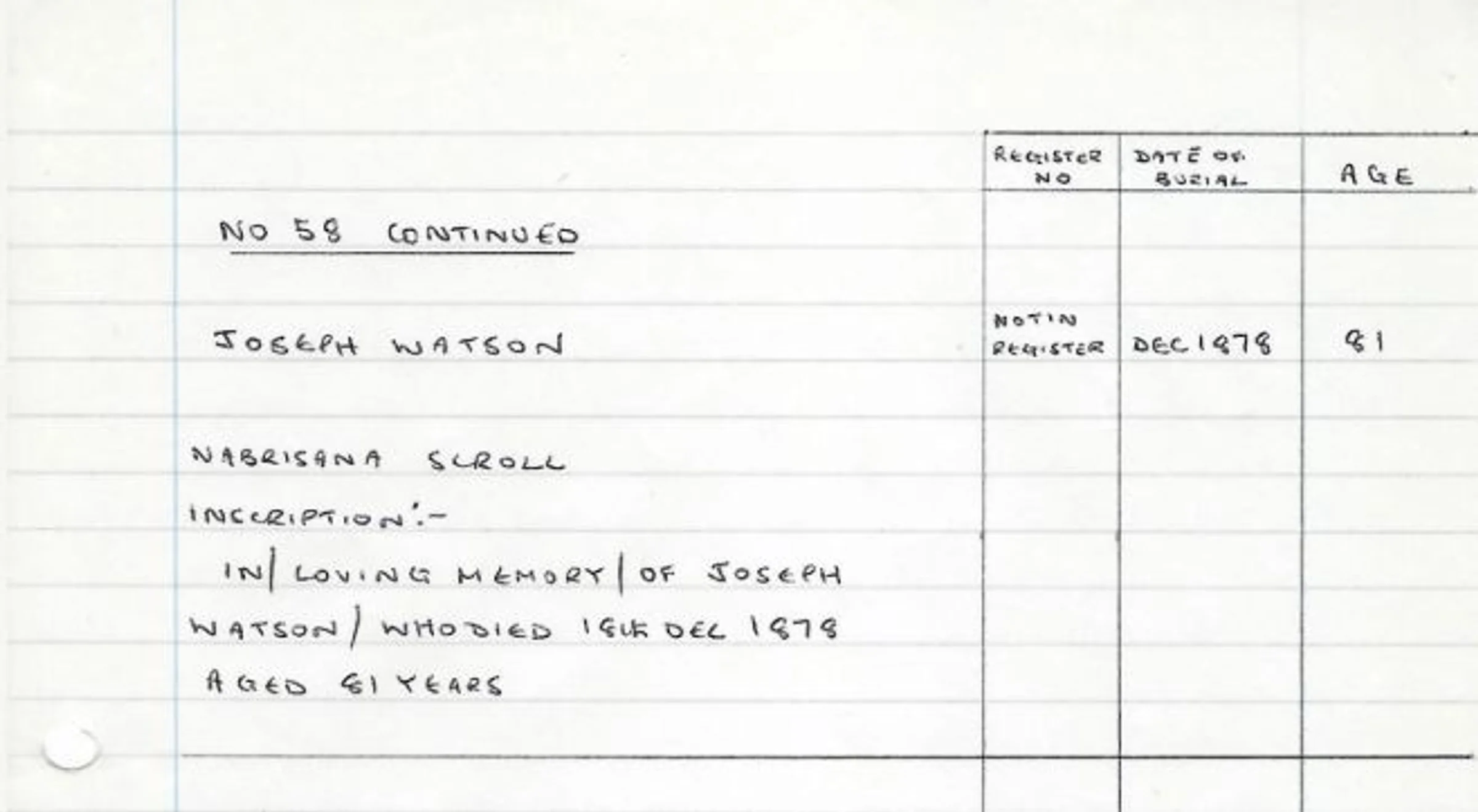 A handwritten record of the memorials for Grave 58 - Joseph Watson in 1878. This memorial was removed to Grave 58 when the Church Hall was built along with others.
