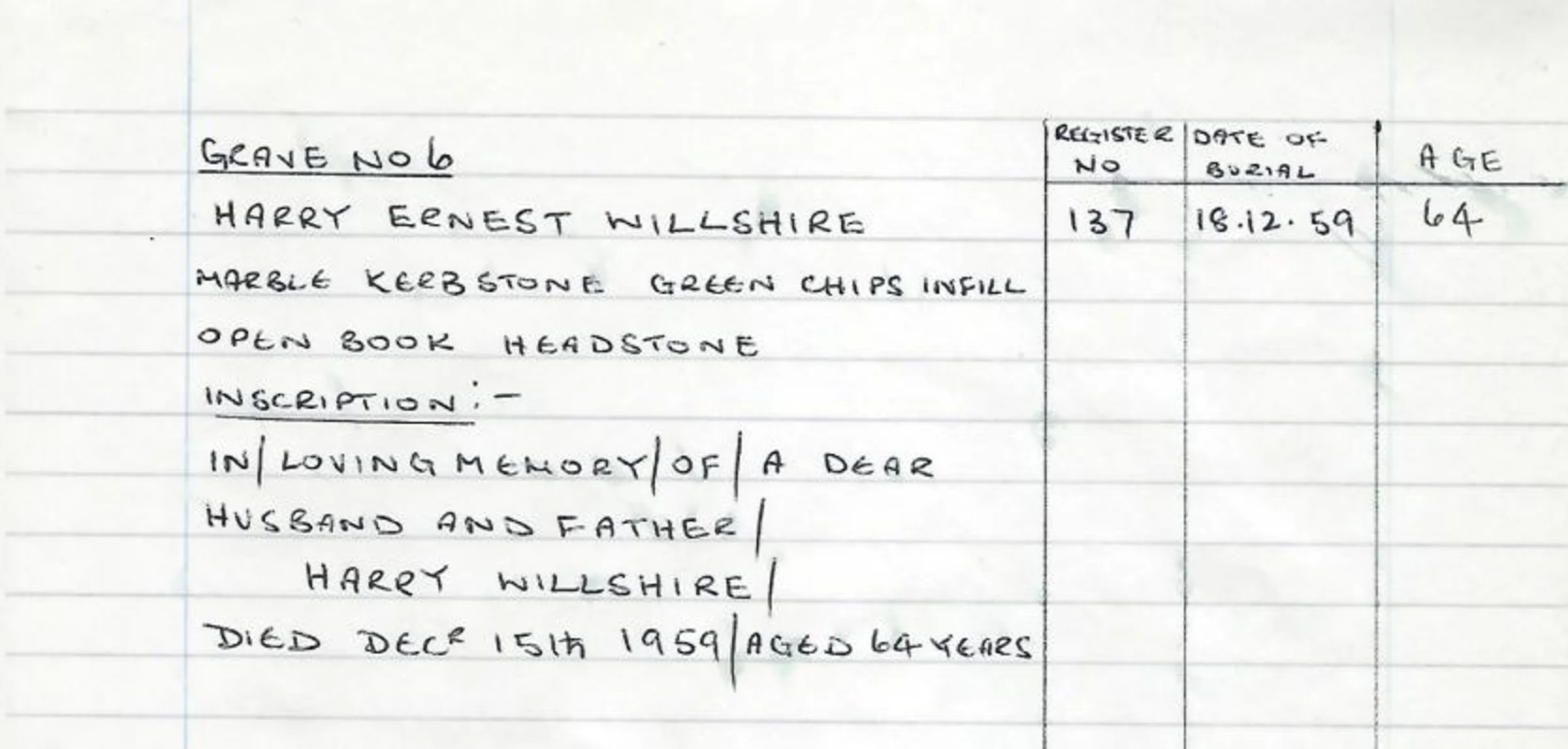 A handwritten record of the headstone for Grave 5, blue area - Harry Ernest Willshire in 1959. His death was registered as Harry E Willsher and Willsher may be what is on the inscription.