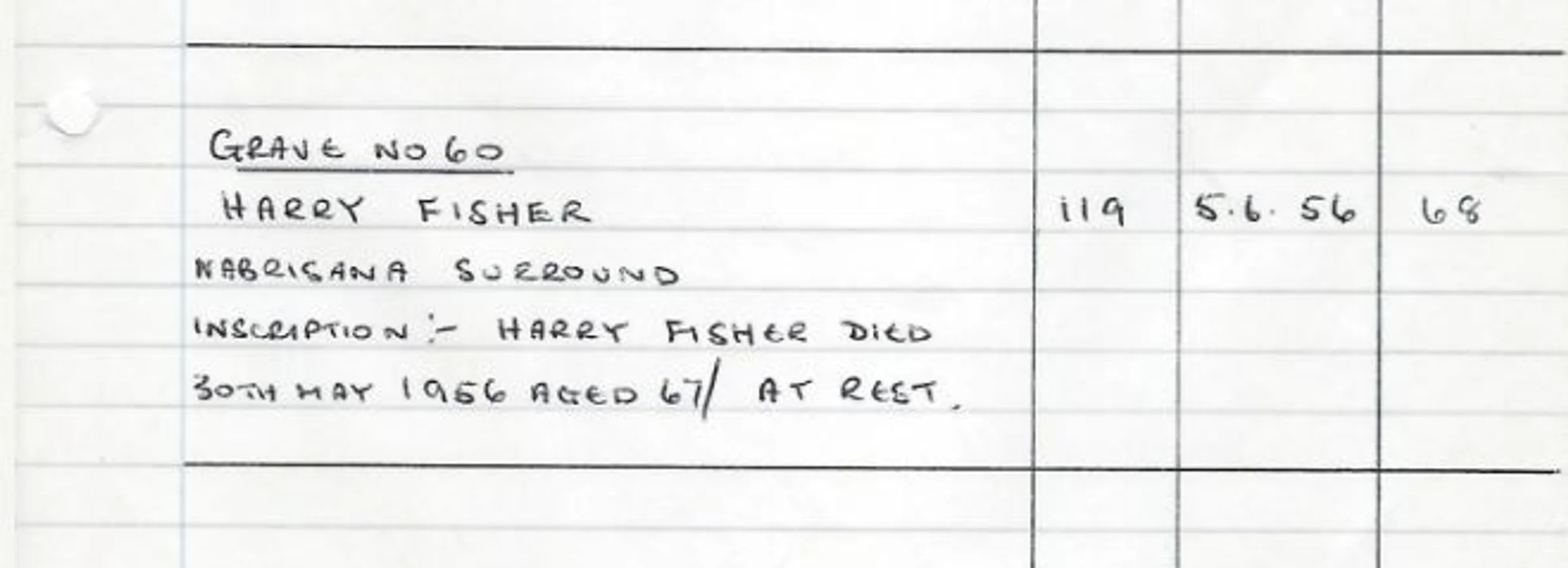 A handwritten record of the headstone for Grave 60, blue area - Harry Fisher in 1956.