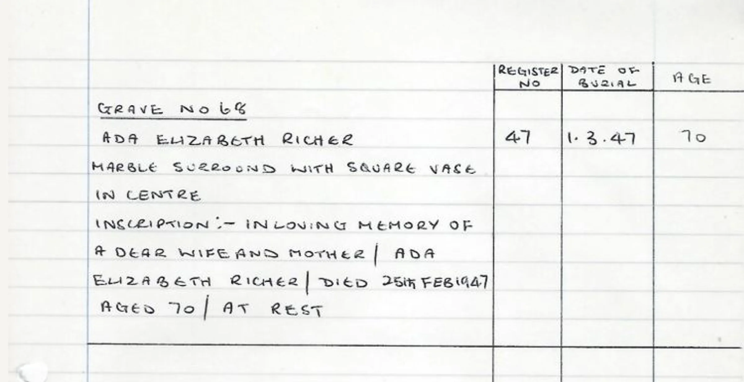 A handwritten record of the headstone for Grave 68, blue area - Ada Elizabeth Richer in 1947.