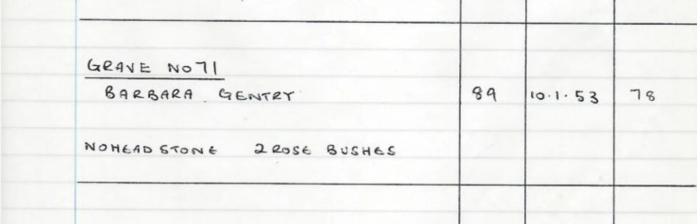 A handwritten record of the headstone for Grave 71, blue area - Barbara Gentry in 1953. No headstone but two rosebushes.