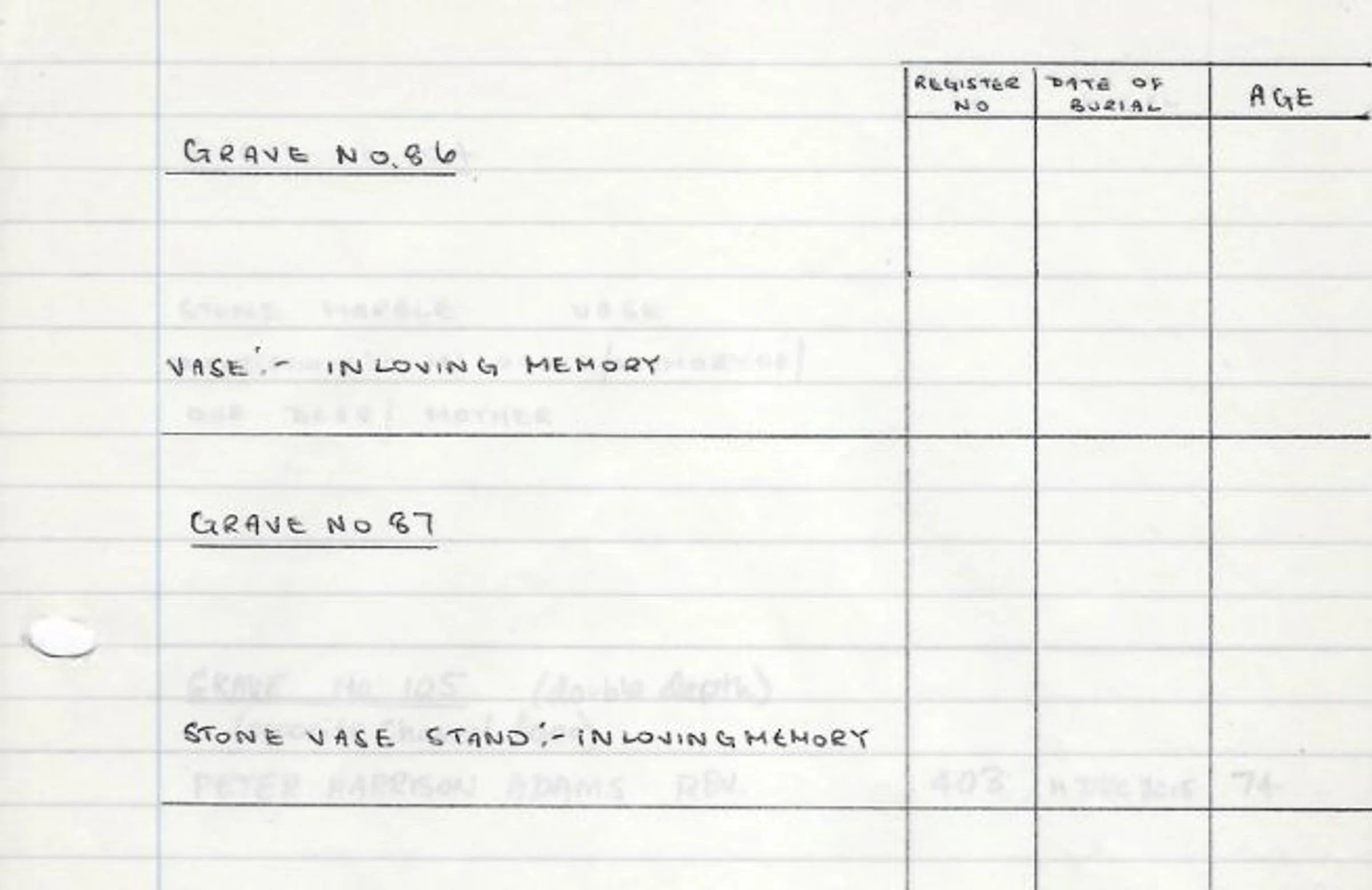 A handwritten record of the headstone for Graves 86 and 87. Both have just a vase with no name or date.