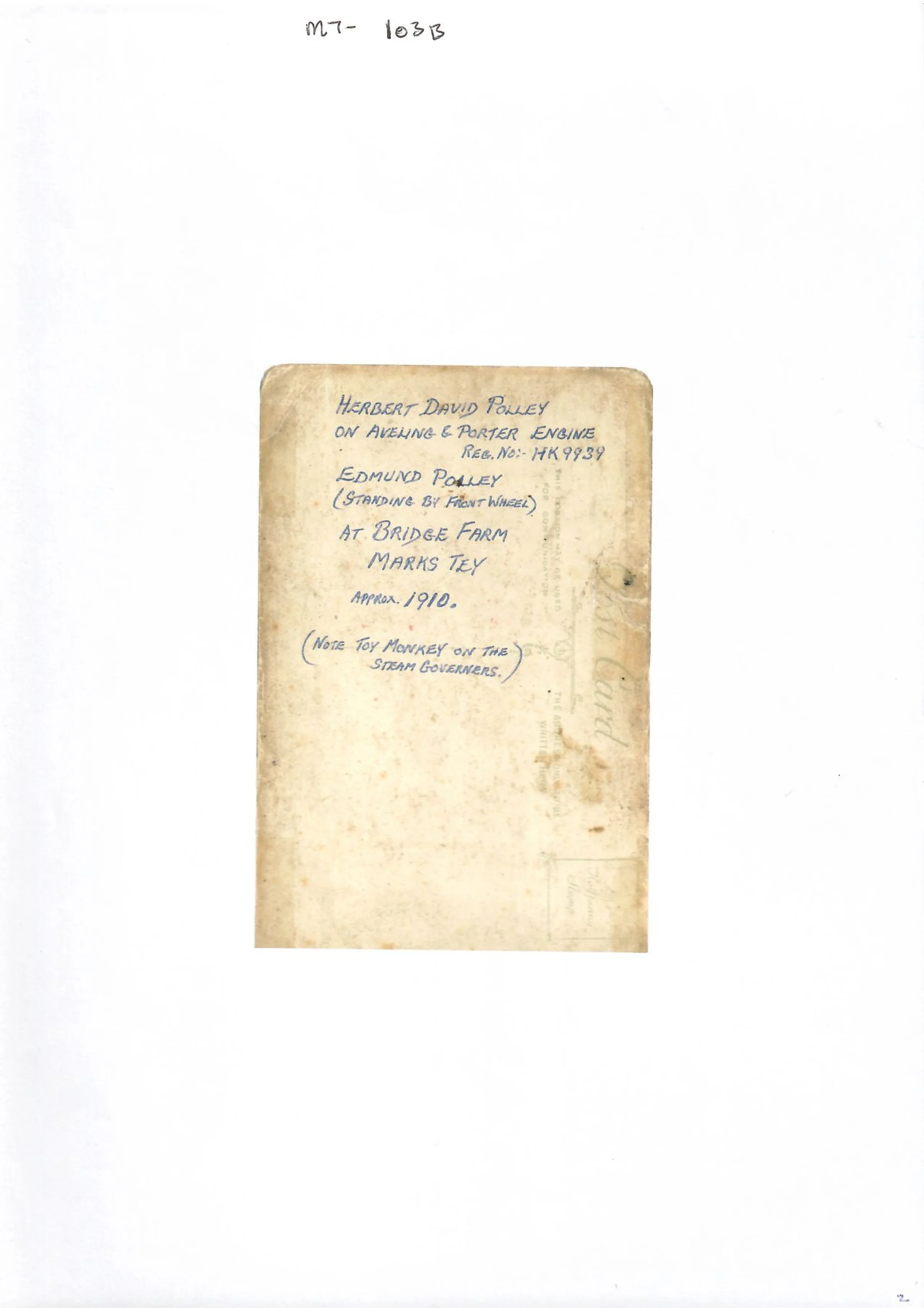 Herbert and Edmund Polley with steam engine at Bridge Farm c1910, reverse