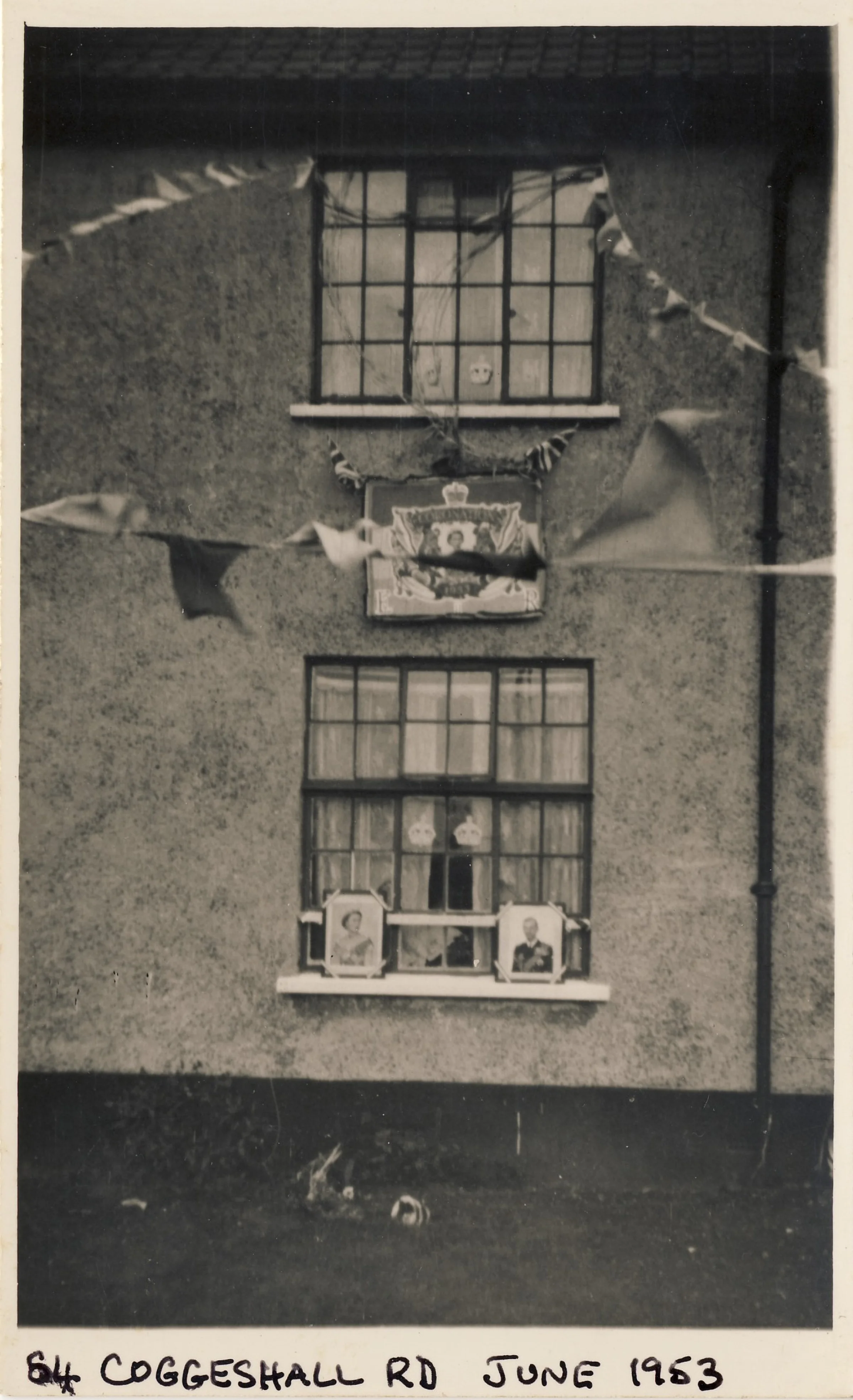 Pauline Mattin, then Robson, was aged 12y at the time of the Coronation in 1953. This is her home at 84 Coggeshall Road, Marks Tey and the house has been decorated for the celebrations.