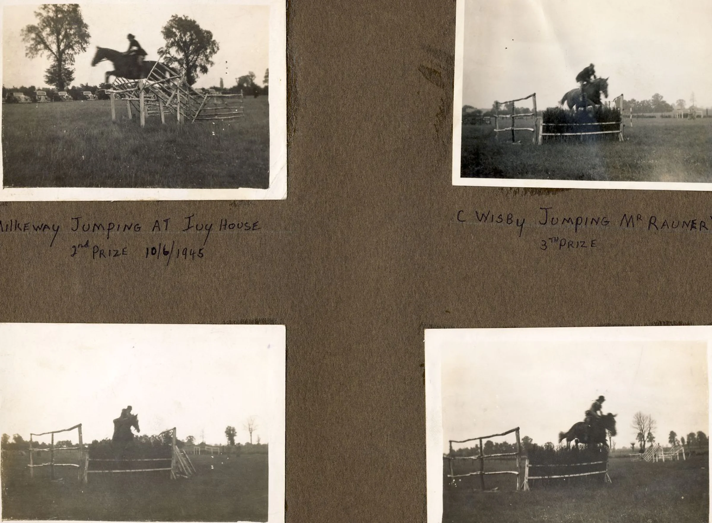 Four photos on a page from an album. One is dated 10 Jun 1945. Another says C Wisby jumping Mr Rauner.