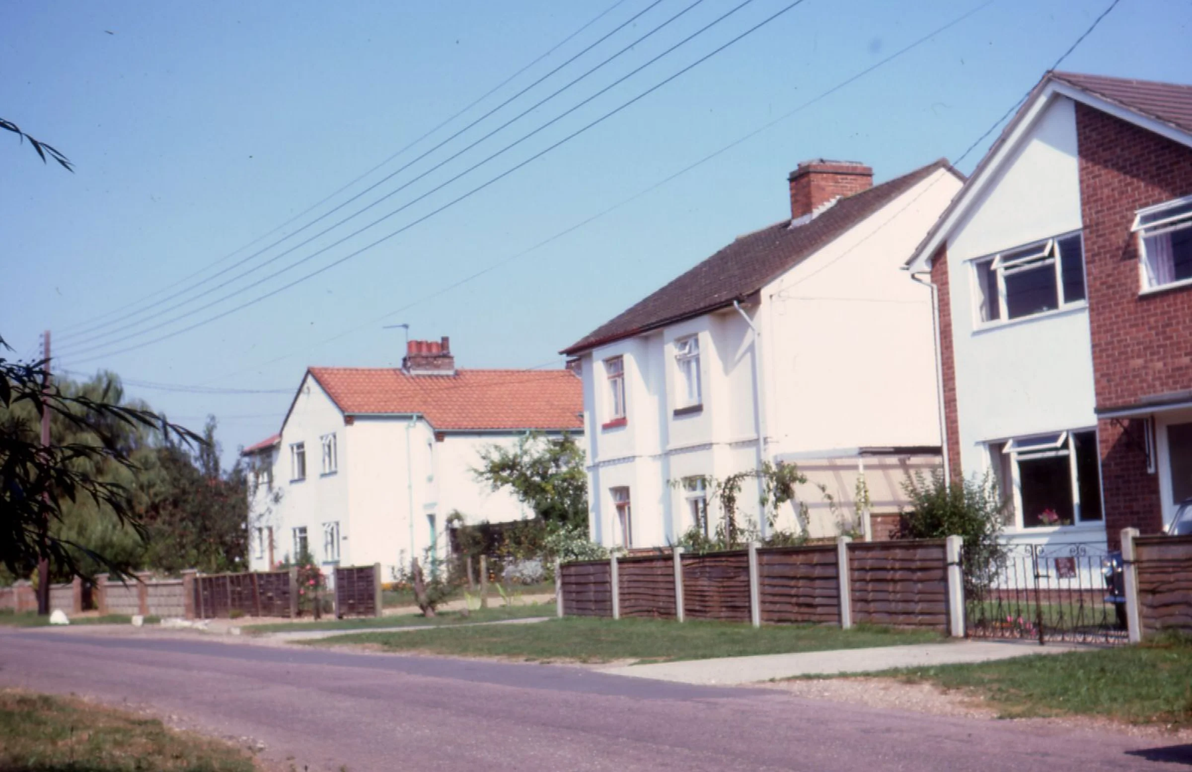 A colour photo of houses in Jays Lane. The house on the right was the home of John and Mary Coffin and was No 39.