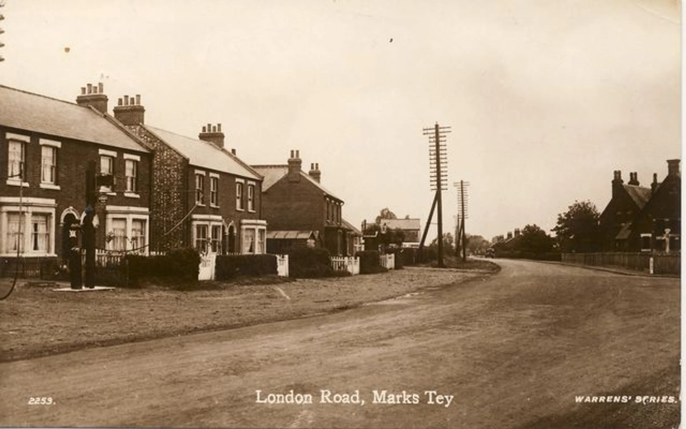 A postcard of London Road, Marks Tey and part of Warrens' Series. The view has the school on the right and signpost at the junction with Coggeshall Road. A close-up view is included here.
