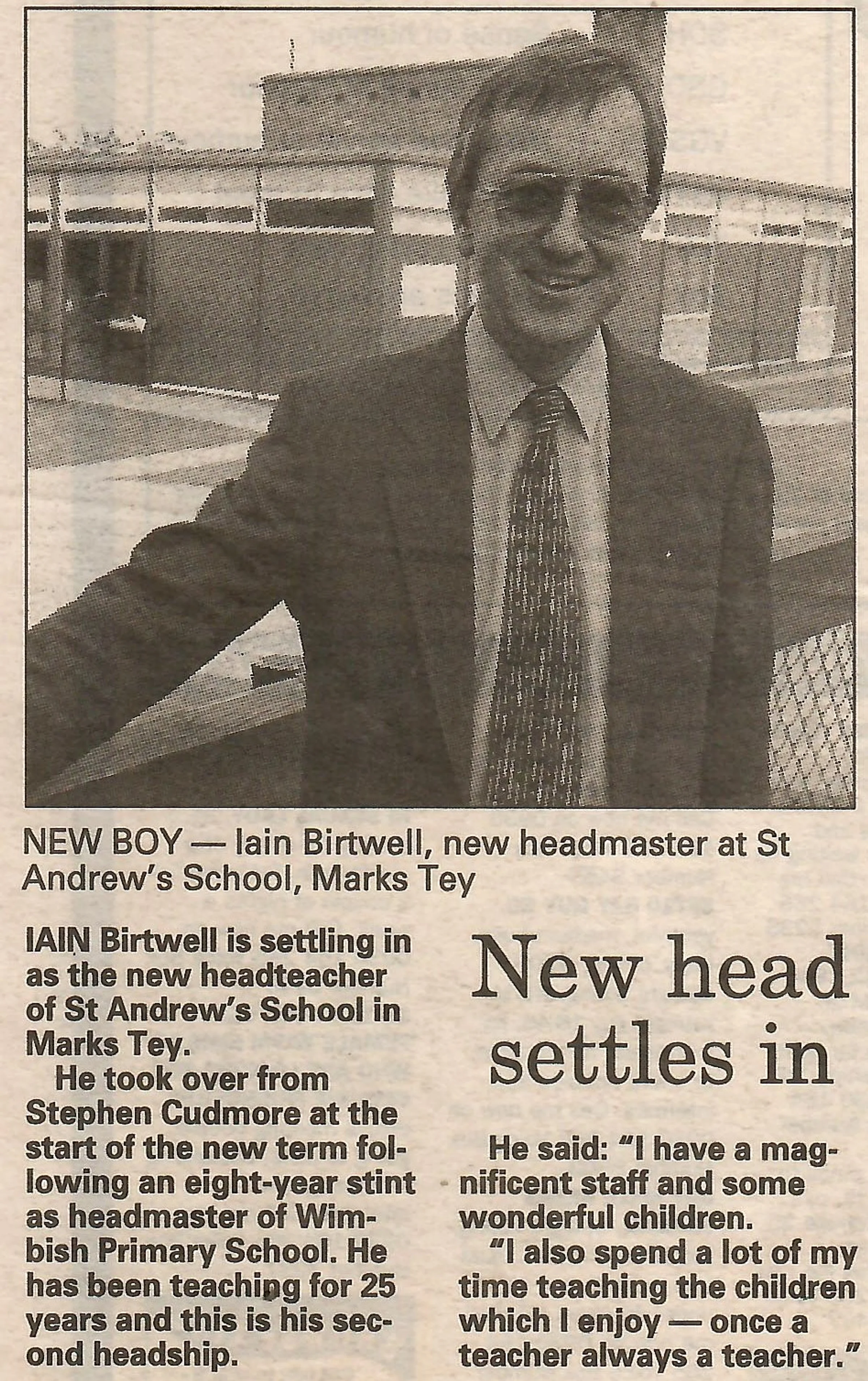 IAIN Birtwell is settling in as the new headteacher of St Andrew's School in Marks Tey. He took over from Stephen Cudmore at the start of the new term following an eight-year stint as headmaster of Wimbish Primary School. He has been teaching for 25 years and this is his second headship.