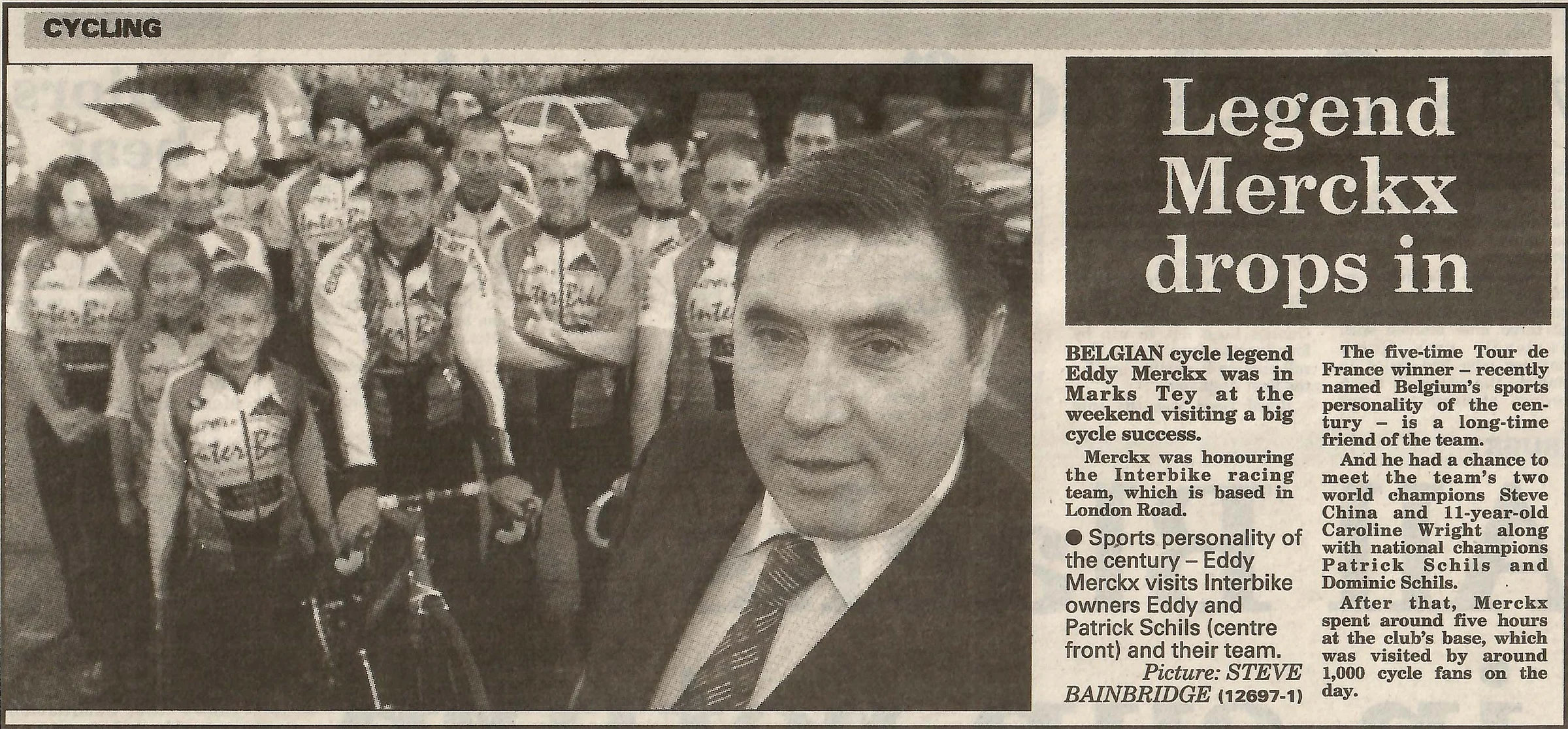 Newspaper photograph and report regarding the visit of cyclist Eddy Merckx to Interbike.
