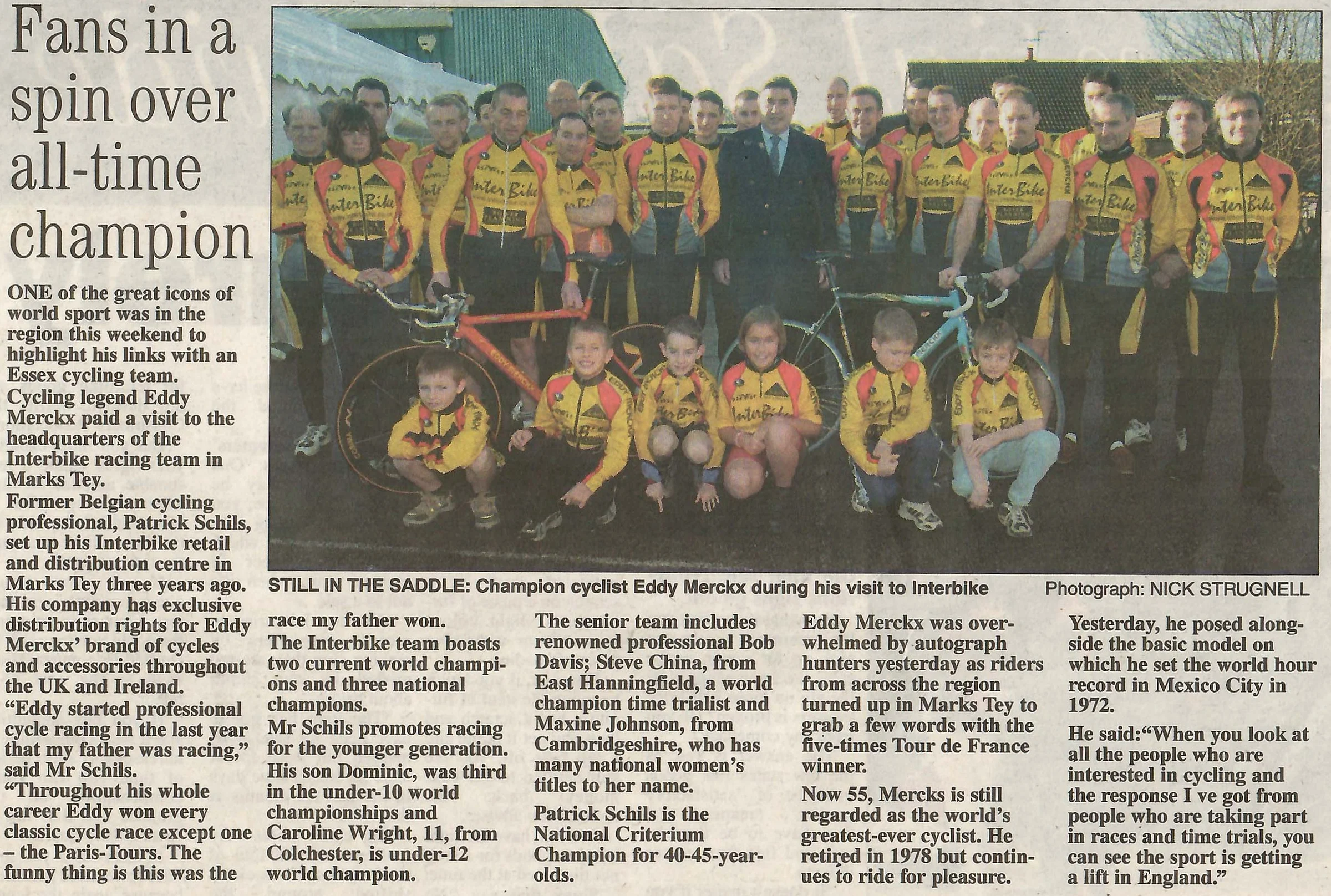 Newspaper photograph and article reporting on a visit by cyclist Eddy Merckx to Interbike.