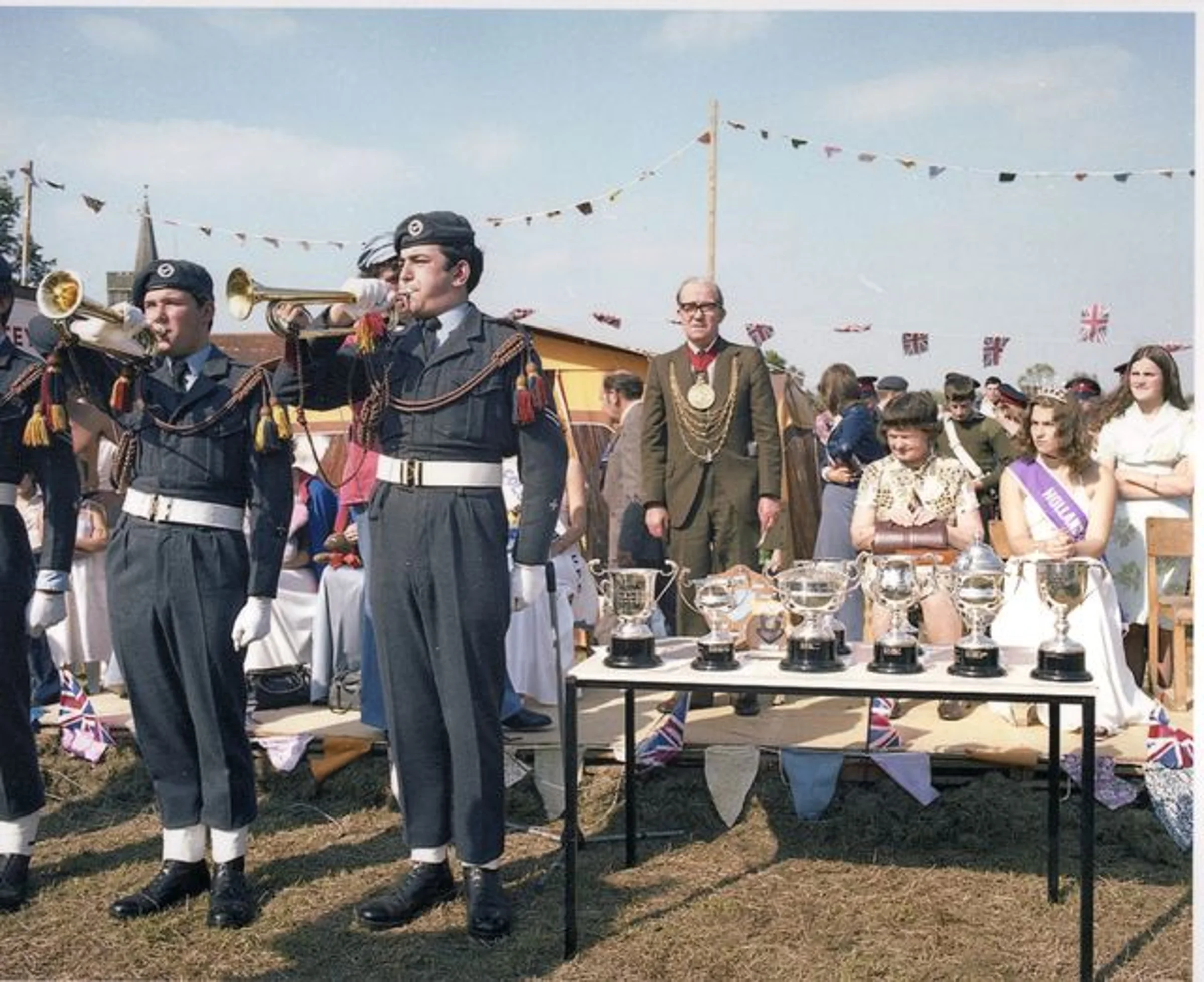 Buglers in uniform performing next to the table of silver cups.