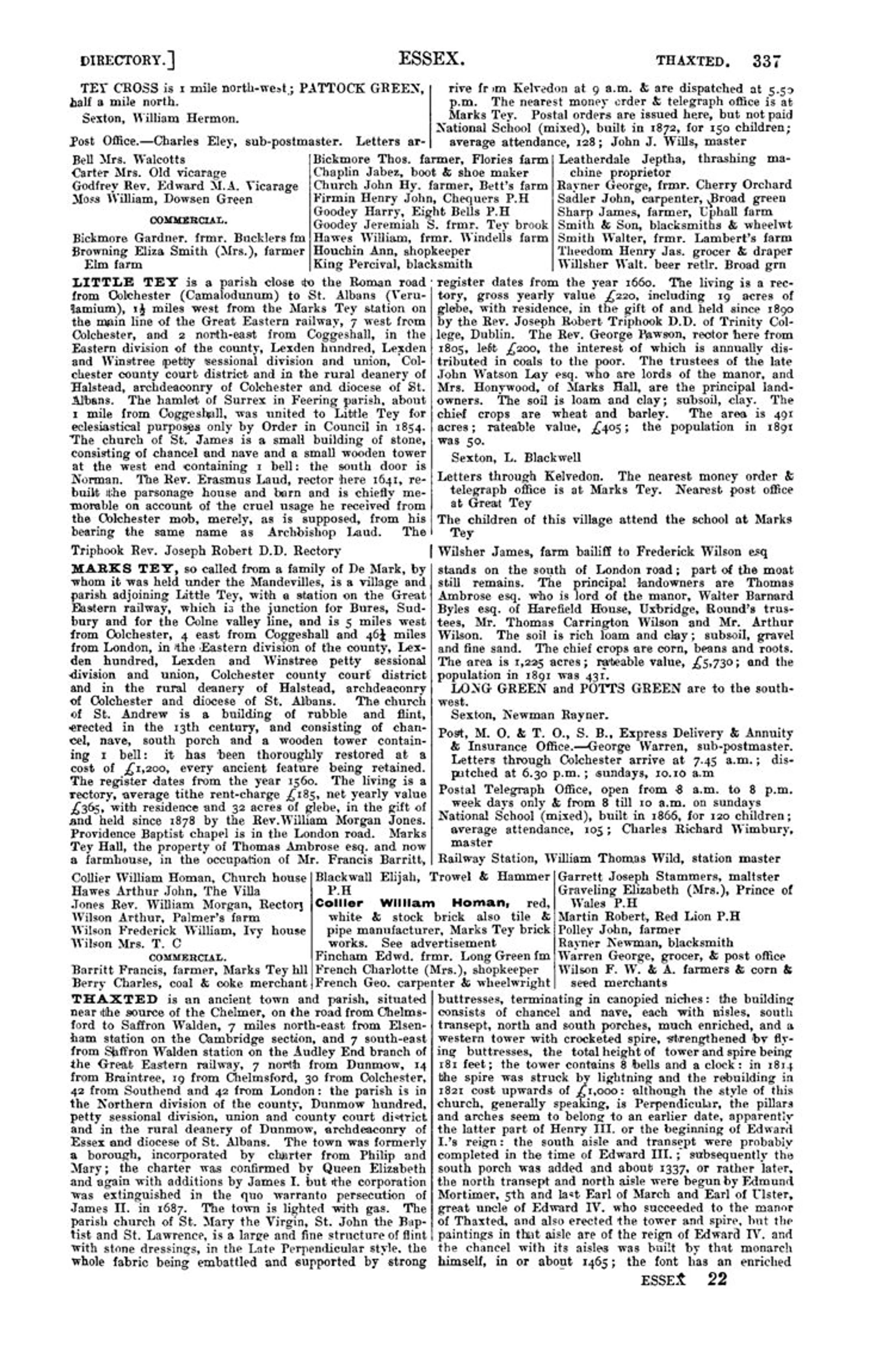 Entries in Kelly's Directory of Essex for 1894 for Little Tey followed by Marks Tey on p337. There is a brief description of each village, its history, crops and population and the local facilities etc. Names and addresses of gentry and tradespeople are provided.