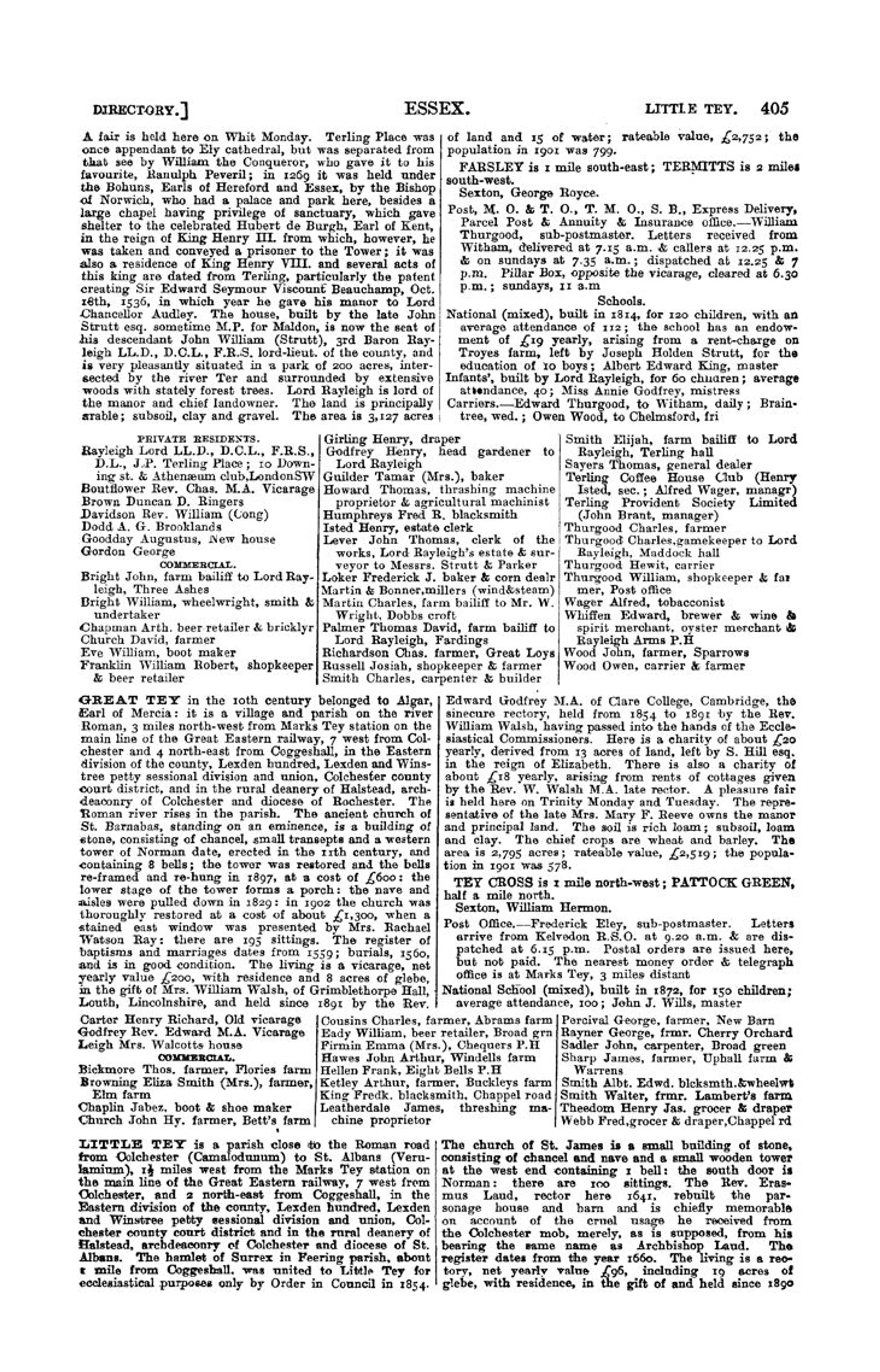Entries in Kelly's Directory of Essex for 1902 for Little Tey on p405 followed by Marks Tey on p406. There is a brief description of each village, its history, crops and population and the local facilities etc. Names and addresses of gentry and tradespeople are provided.