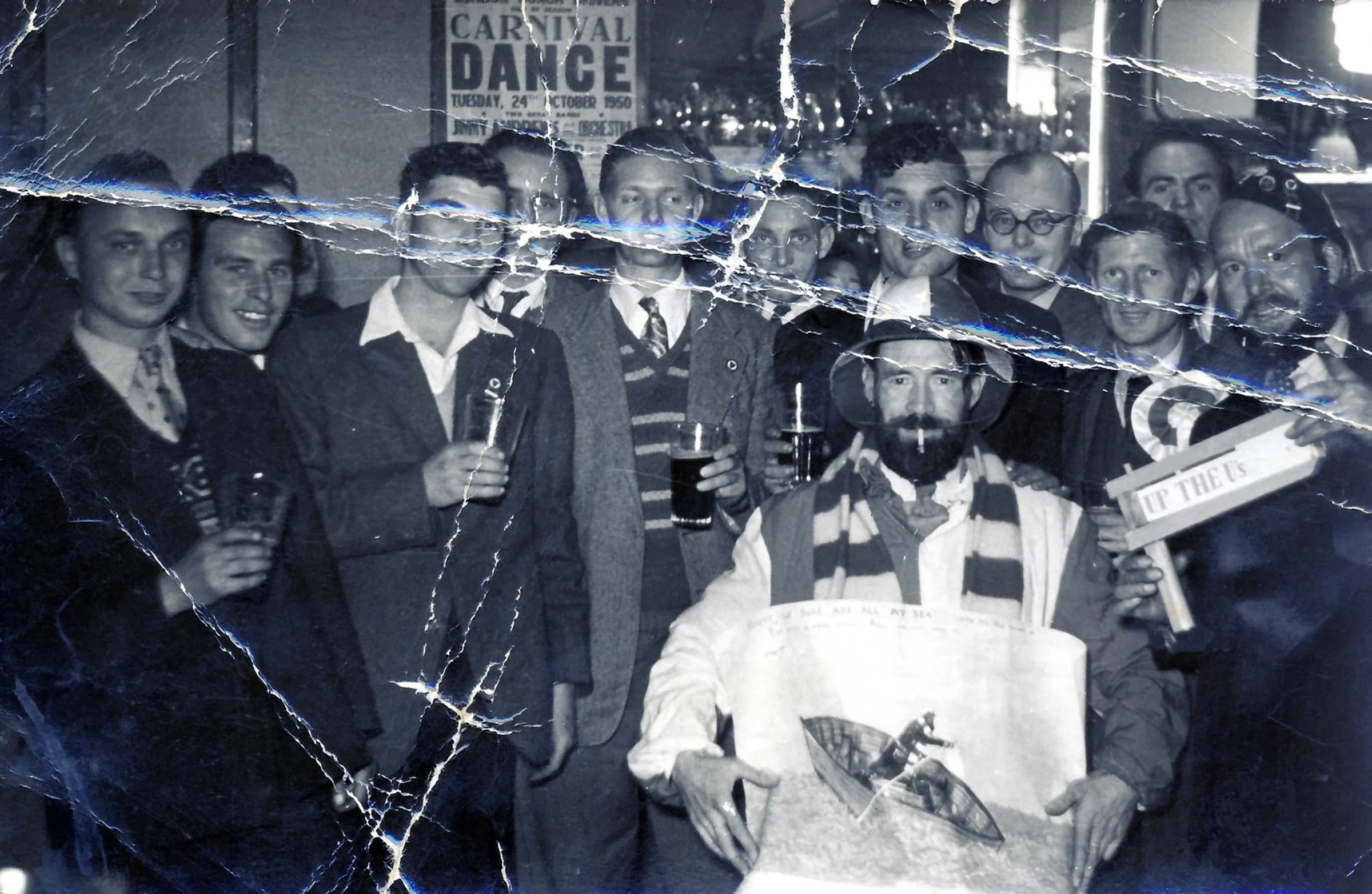 A group of men with drinks in a bar. A poster behind provides a date of 1950.