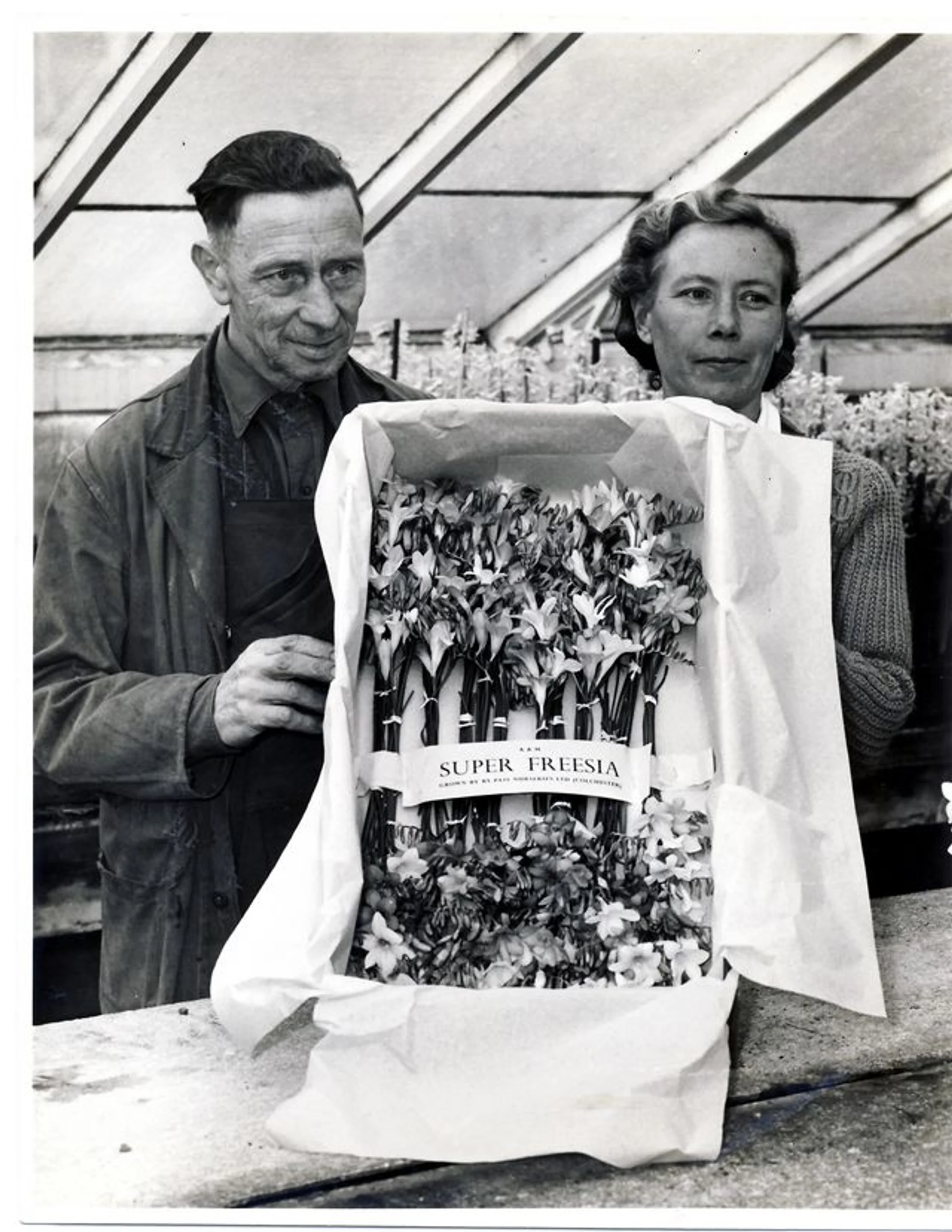Man and woman working in a greenhouse at Bypass Nurseries, holding up a box of freesias. She is Joan Korniej and he is Walter Paskell.