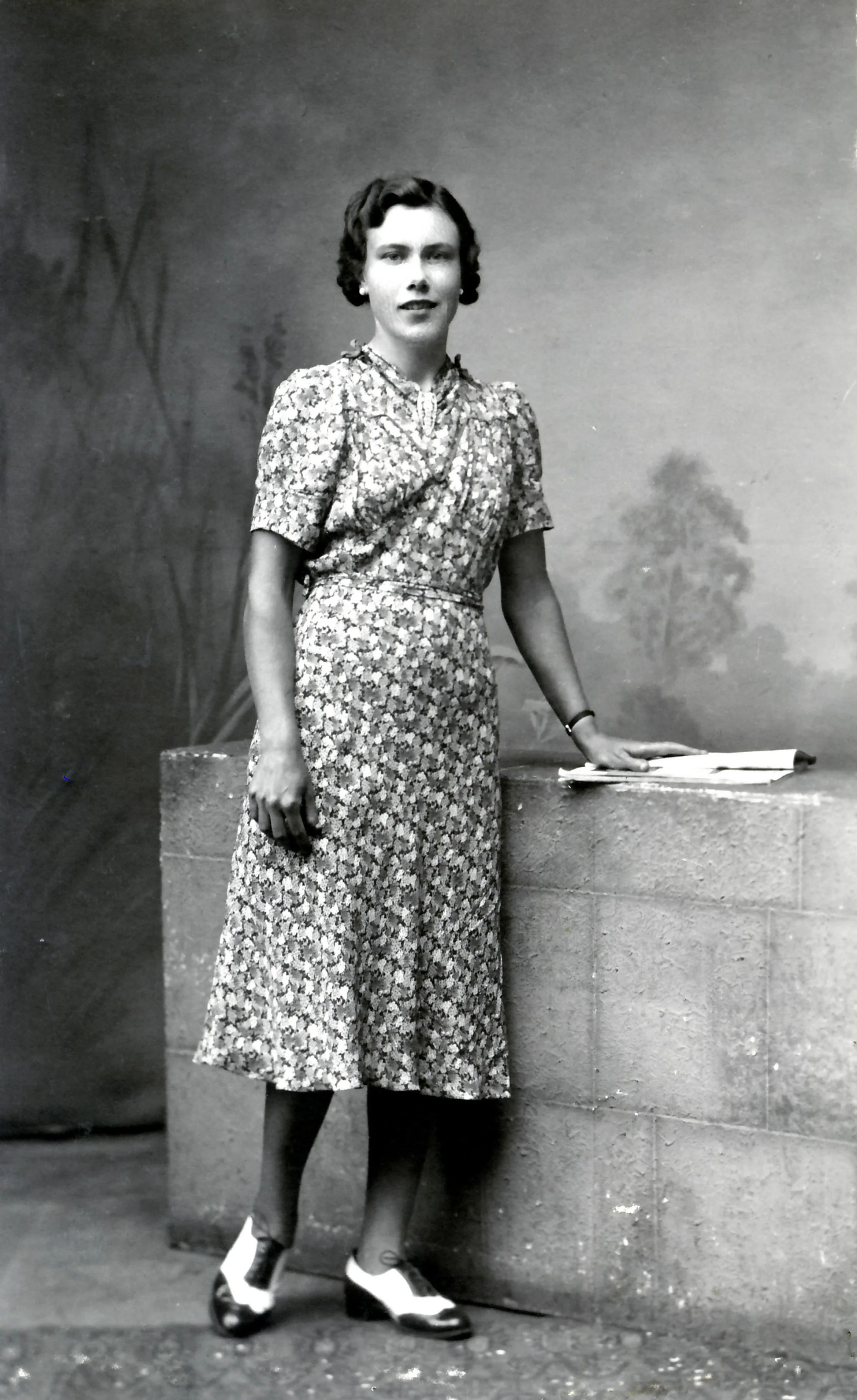 A lady in a patterned dress.