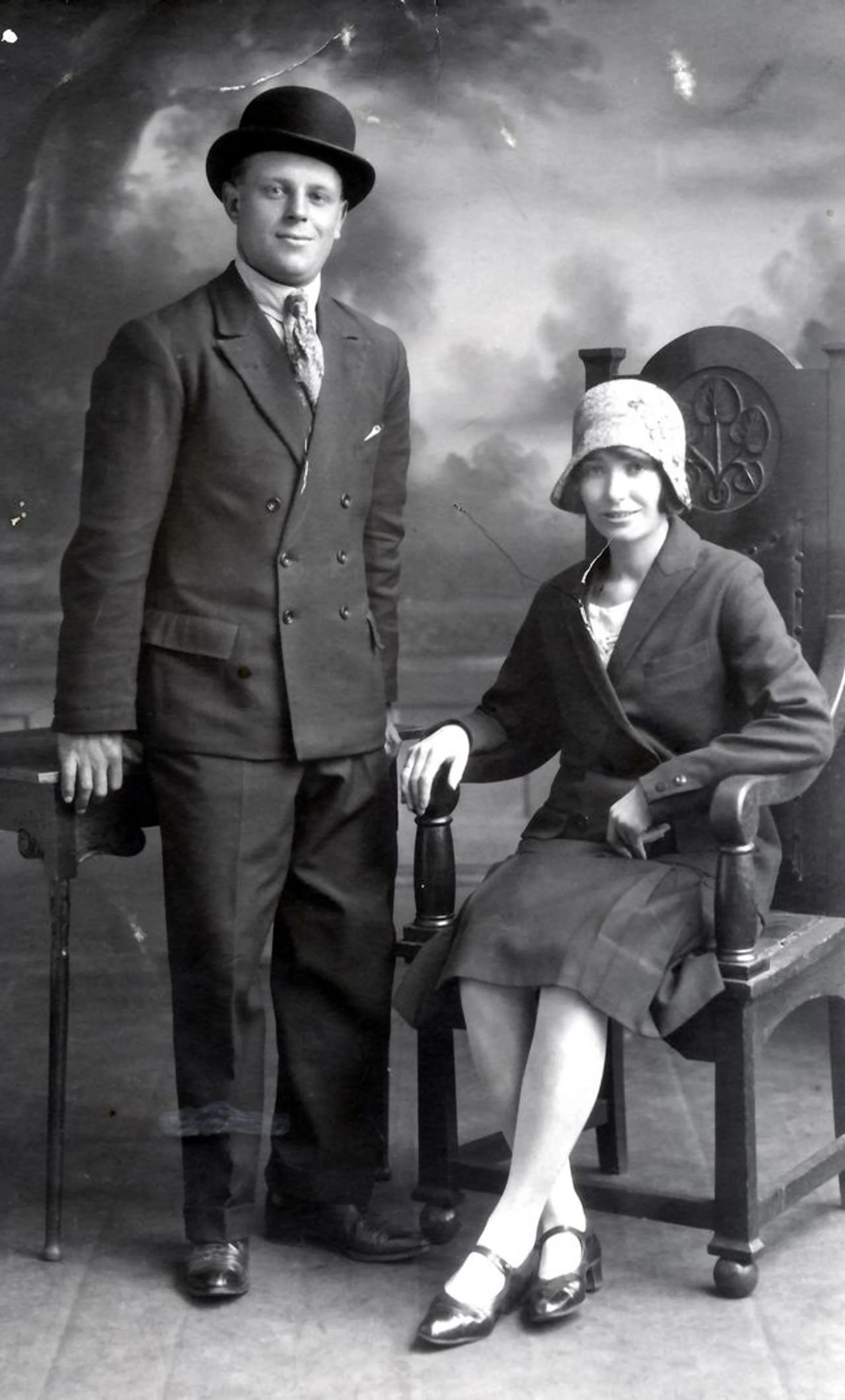 A couple in a studio, man standing, lady seated.