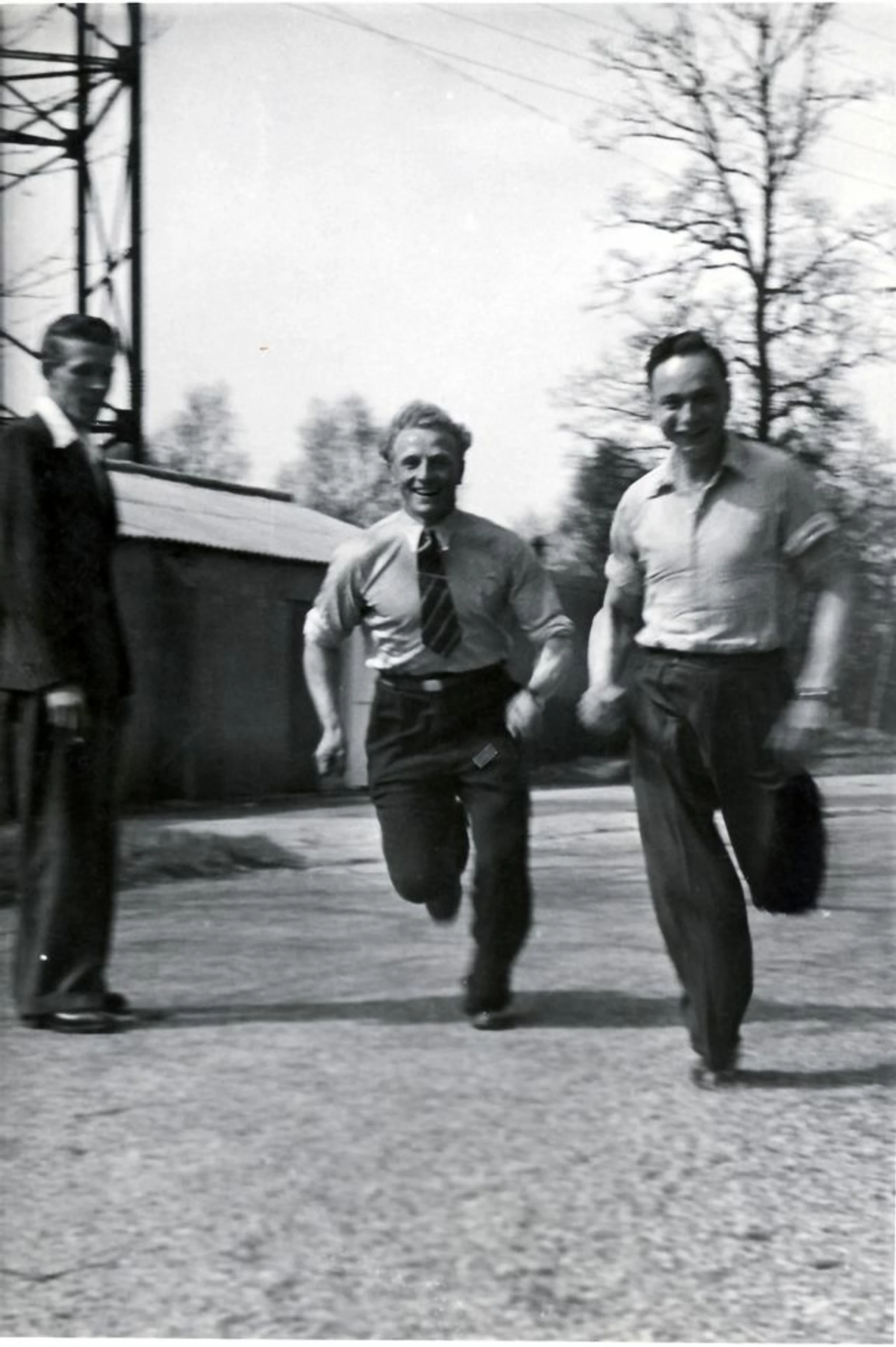 Labelled Camp. Three men with mast beyond.