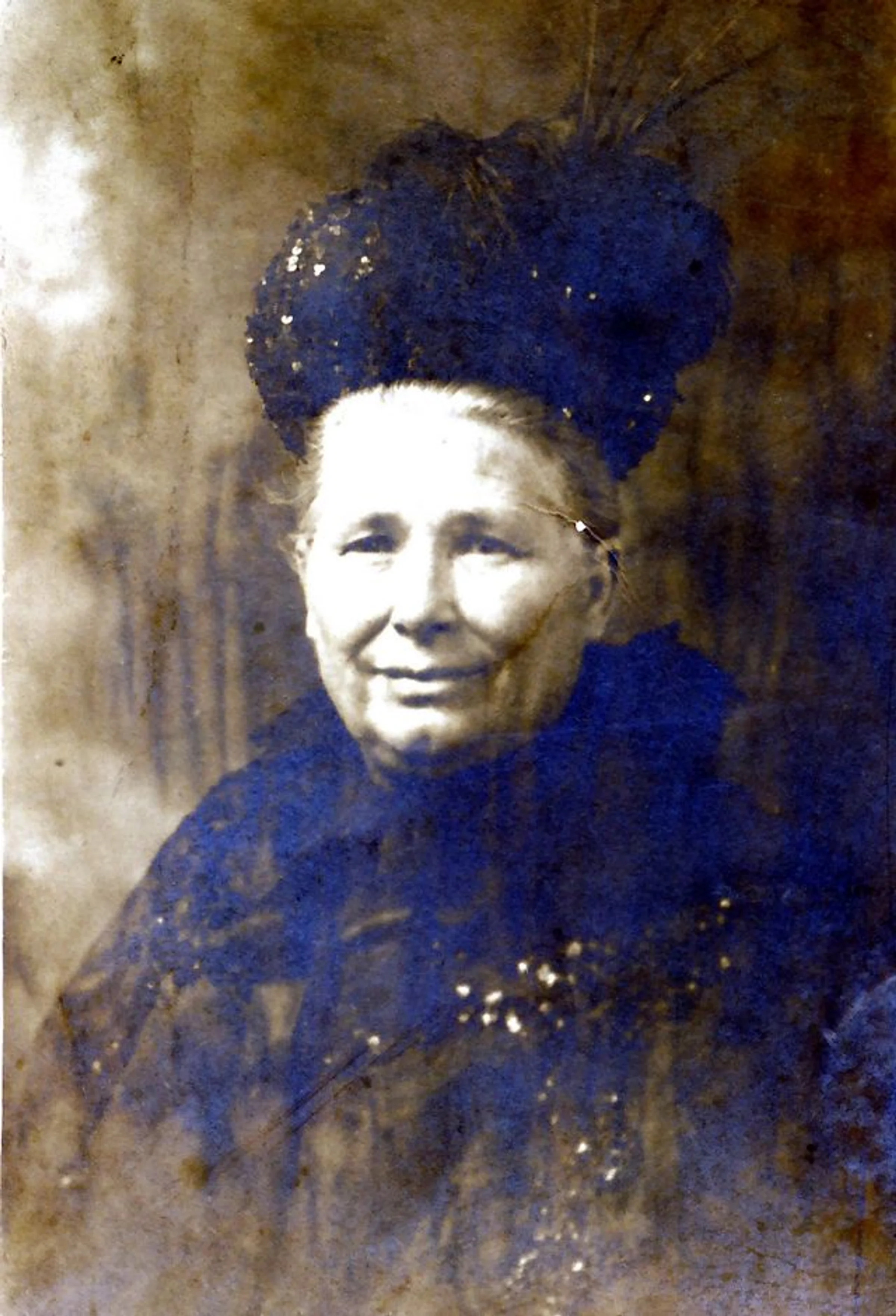An older lady wearing a hat.
