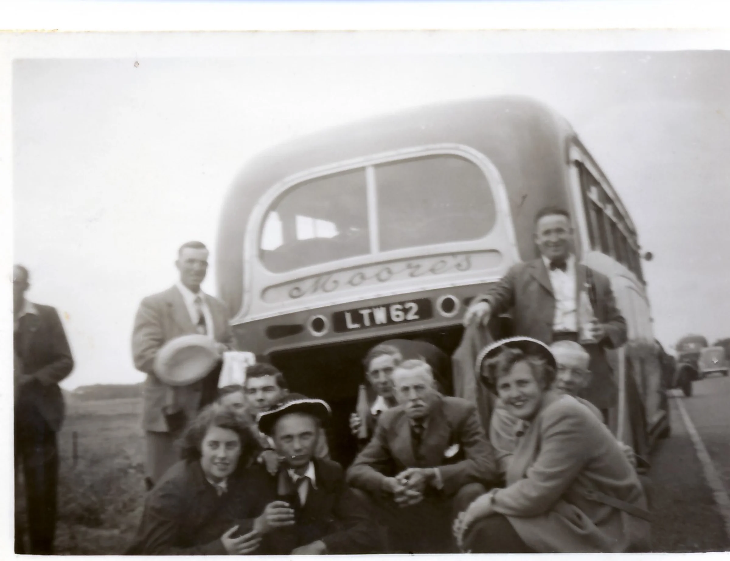 A group of people on an outing in a Moores coach (registration LTW 62).