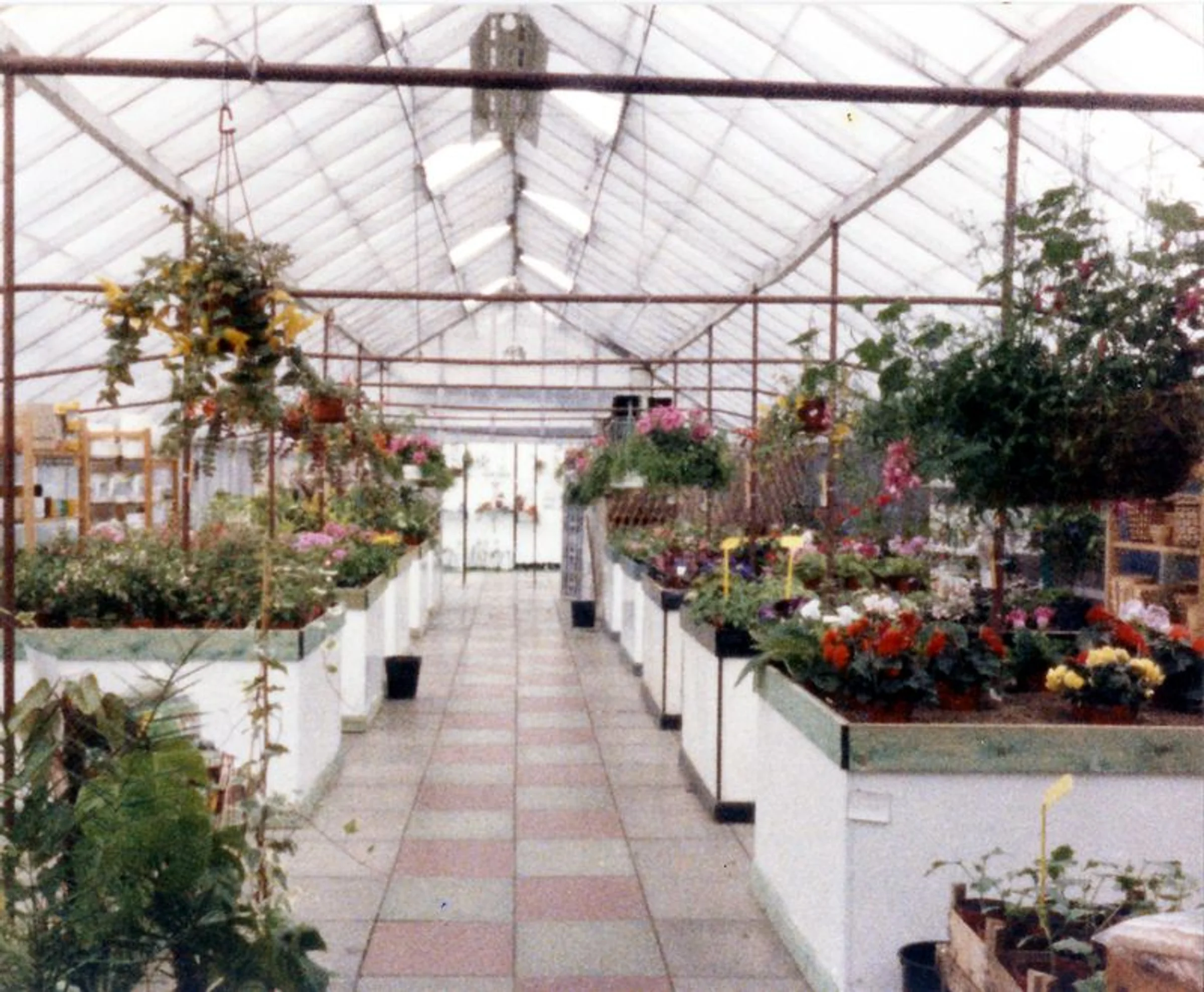 A colour photograph of flowering plants in a greenhouse.