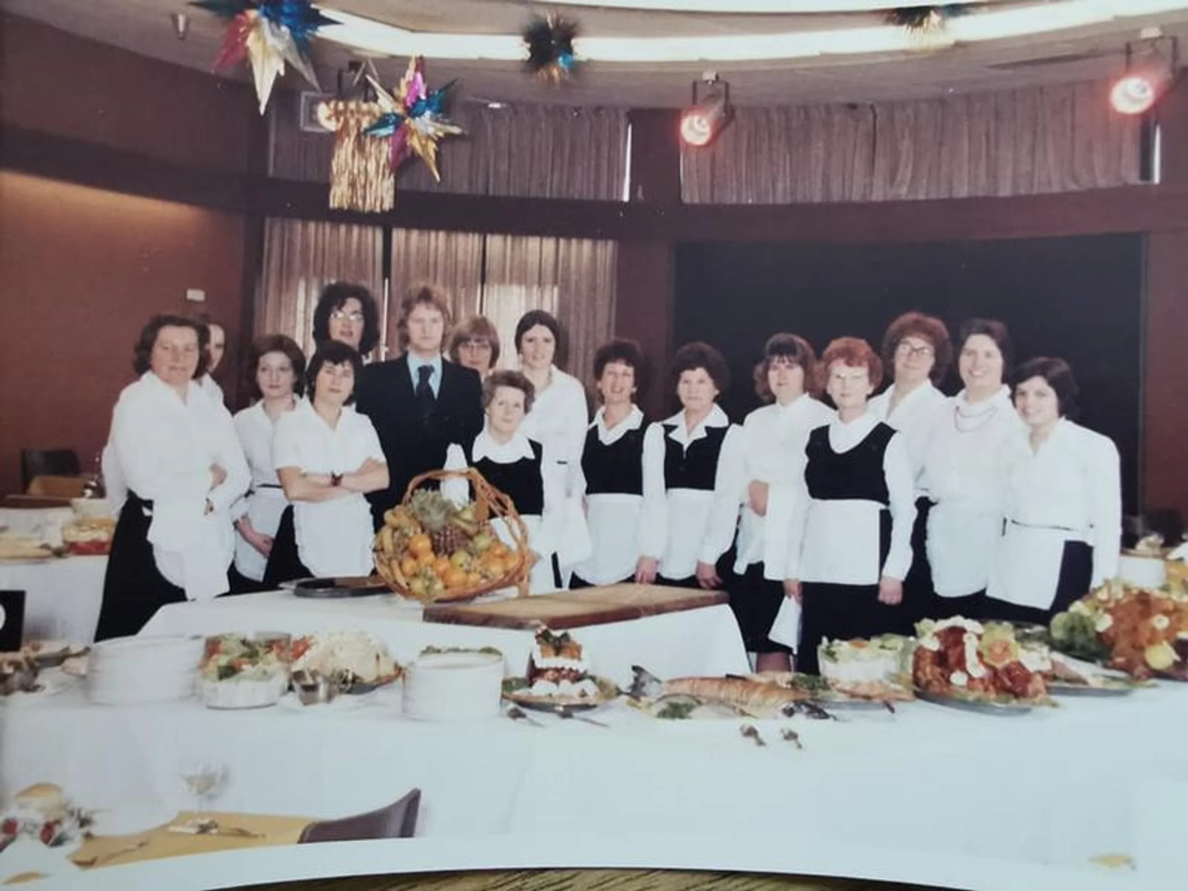 Undated photo showing the last time that Silver Service was provided at the Marks Tey Hotel. The waitresses are dressed formally in black and white.