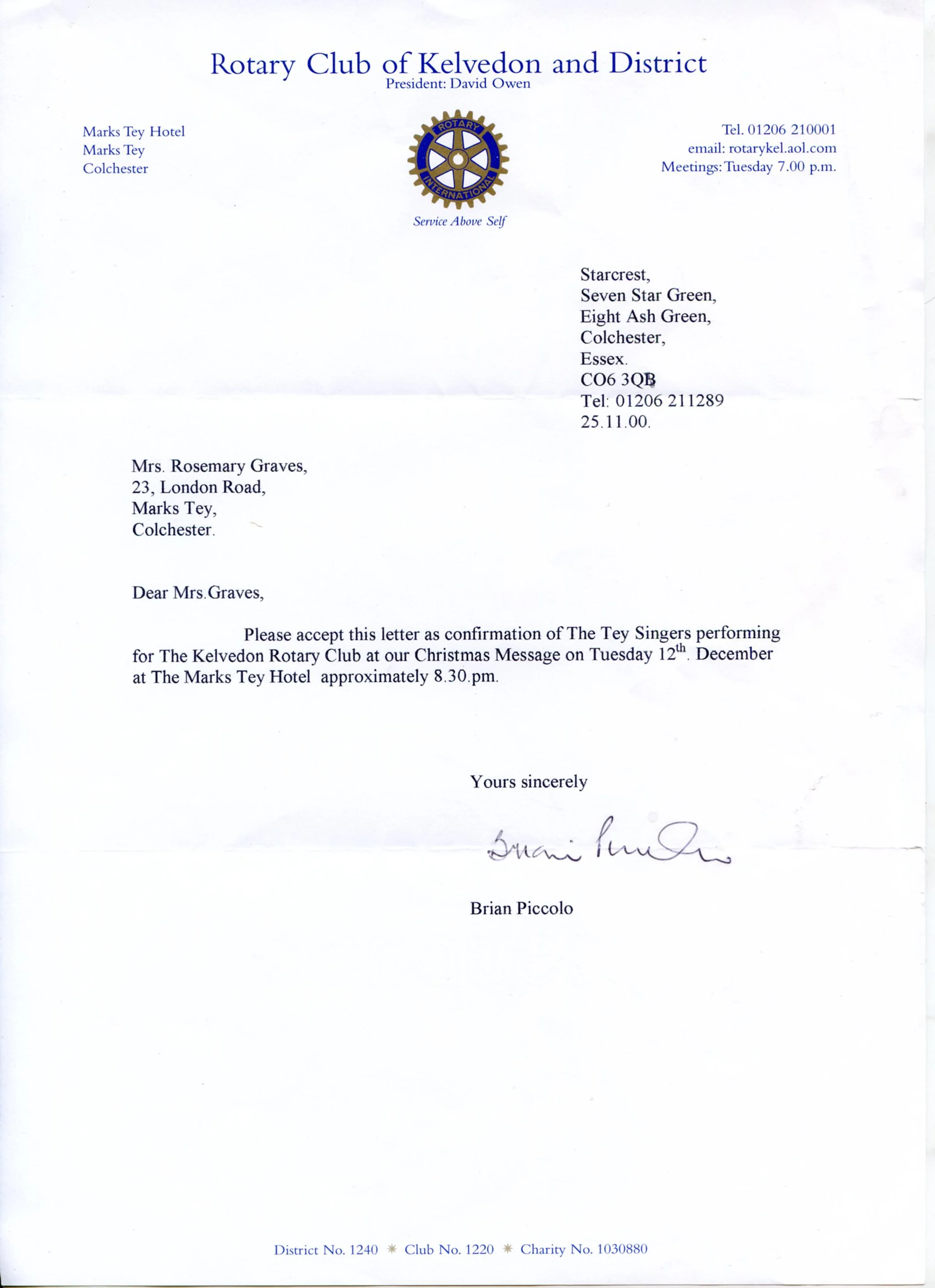A letter from Brian Piccolo to Rosemary Graves regarding the arrangements for the singing of carols at Marks Tey Hotel by The Tey Singers on Tuesday 12 December 2000 as Christmas entertainment for The Rotary Club of Kelvedon and District.