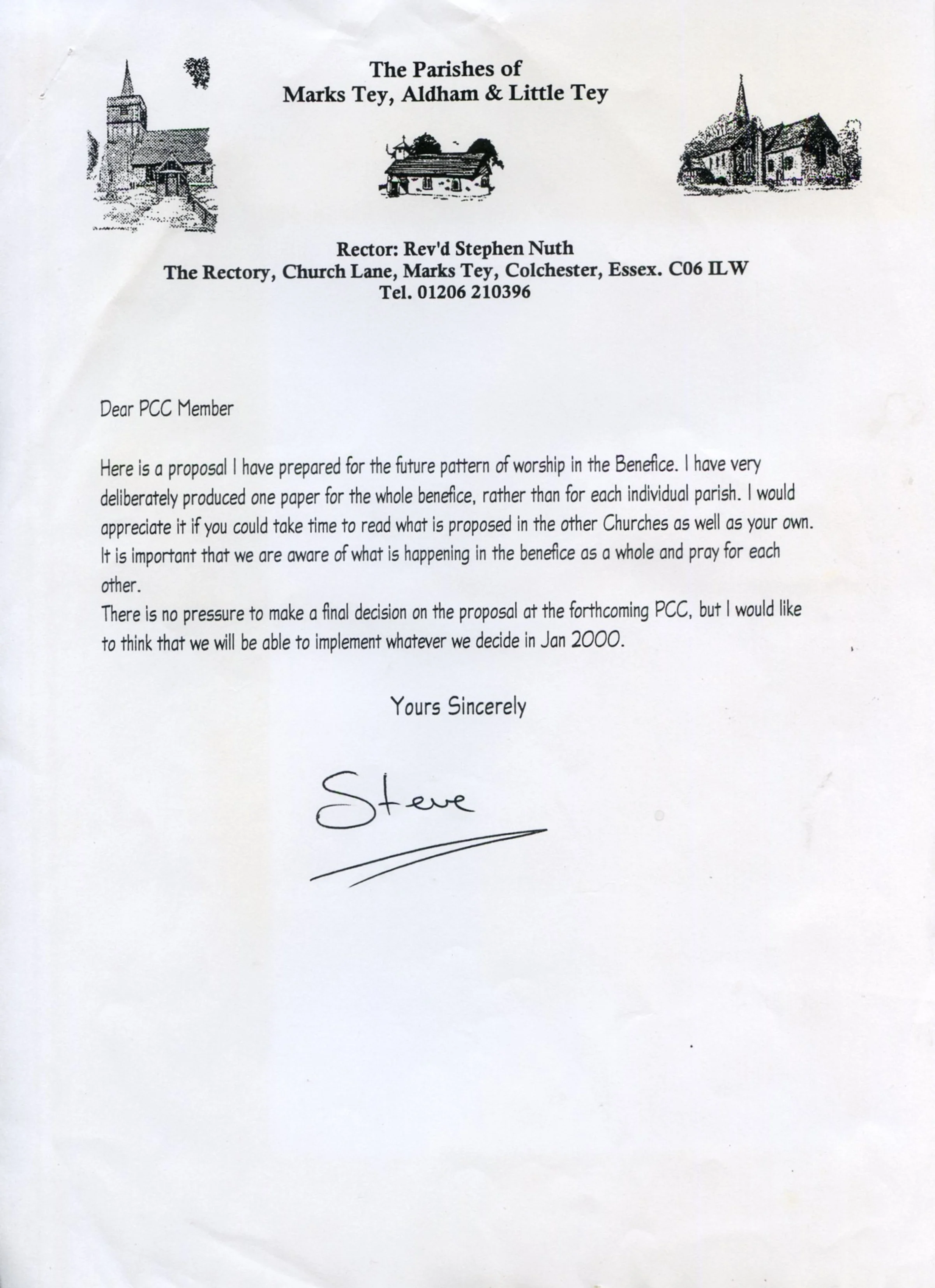 A letter to PCC Members in the Parishes of Marks Tey, Aldham and Little Tey from Rector, Rev Steve Nuth, about proposed changes to the pattern of worship in the Benefice, with future changes to begin in January 2000. There follows a detailed list of the services that would take place in Marks Tey and Aldham. Little Tey will be leaving the Benefice in 2000 to join with Great Tey.