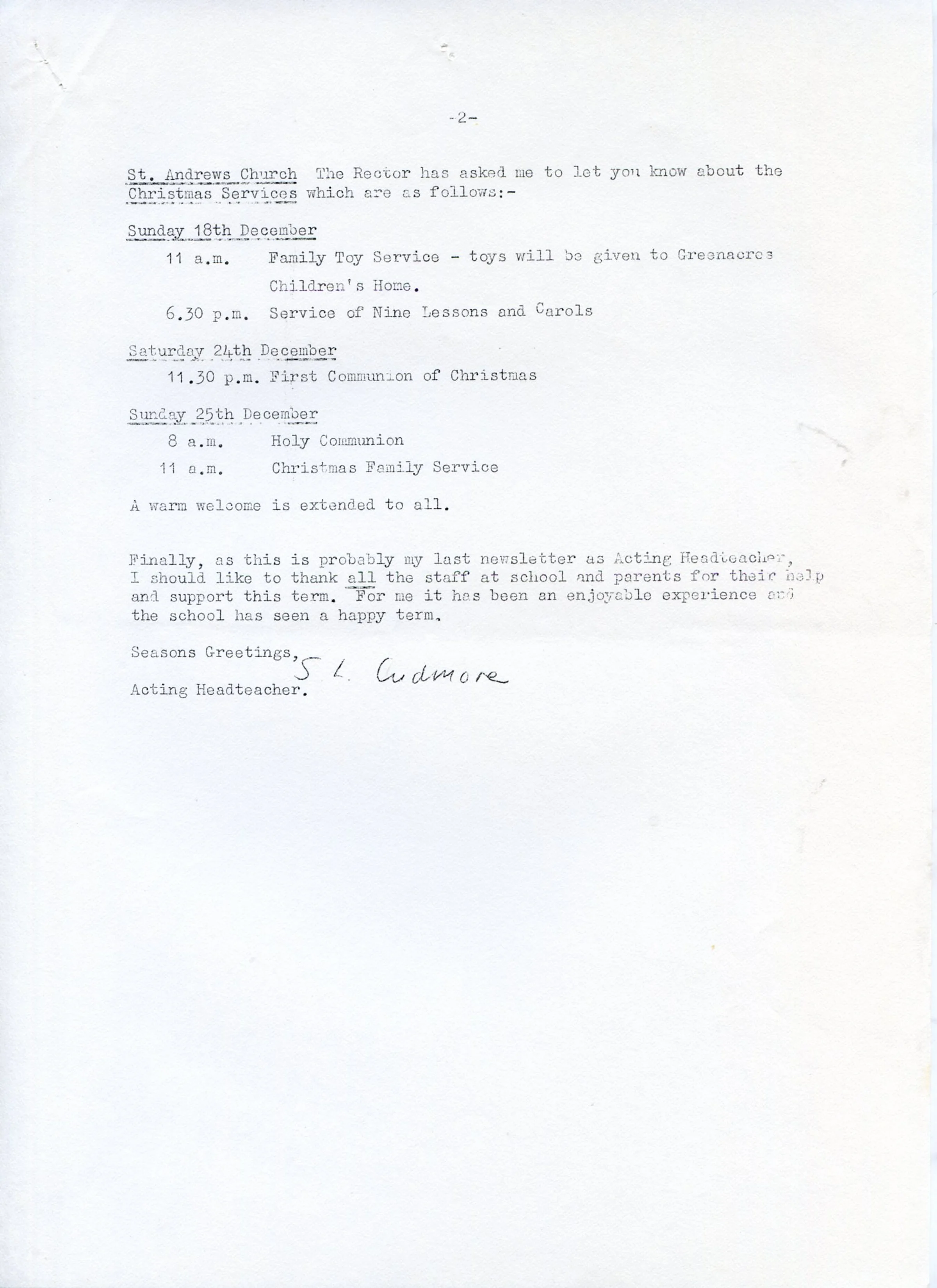 Letter to parents, December 1988