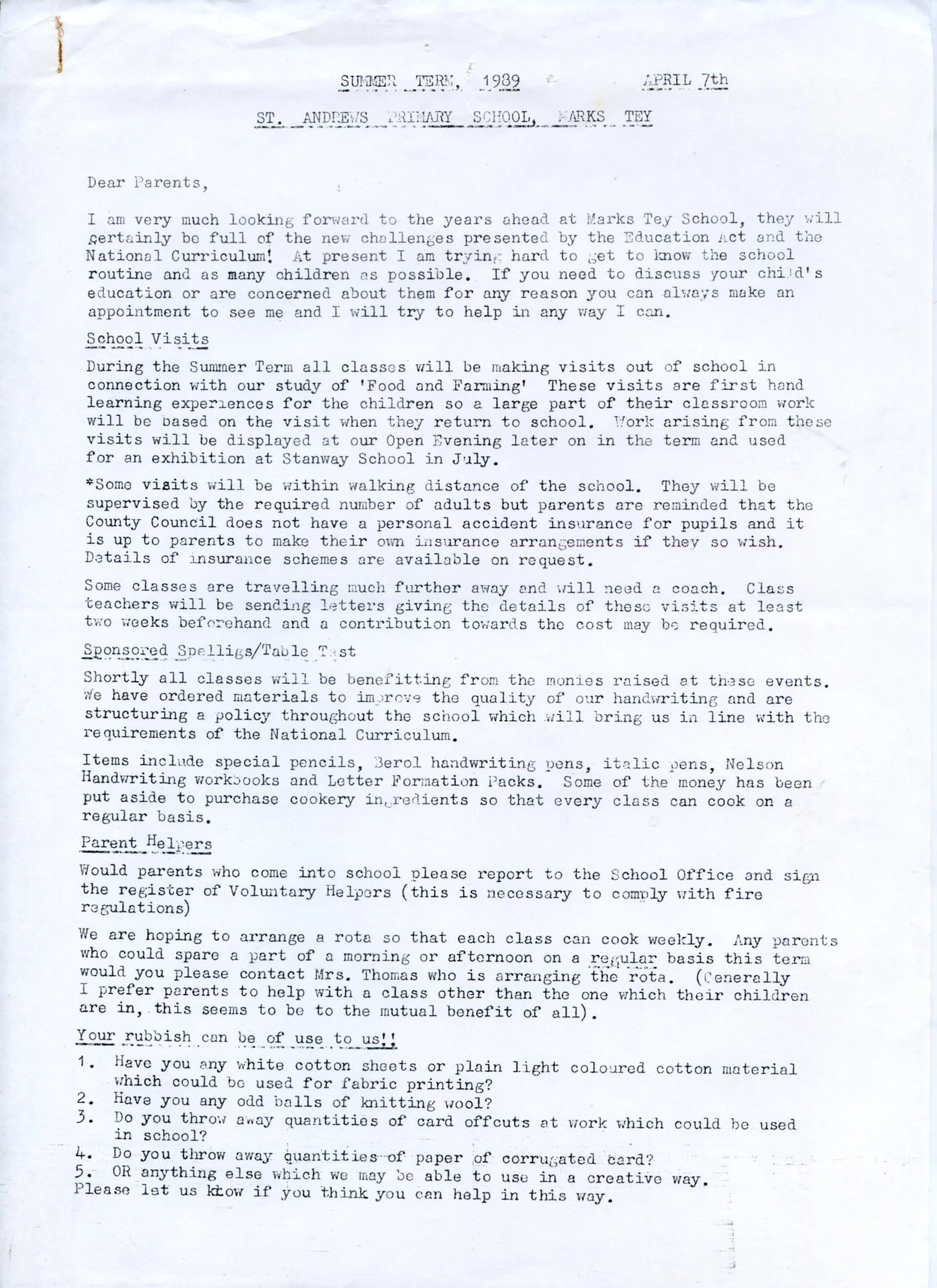 Part of series of letters to the parents from St Andrews Primary School, Marks Tey, concerning school visits and other activities.