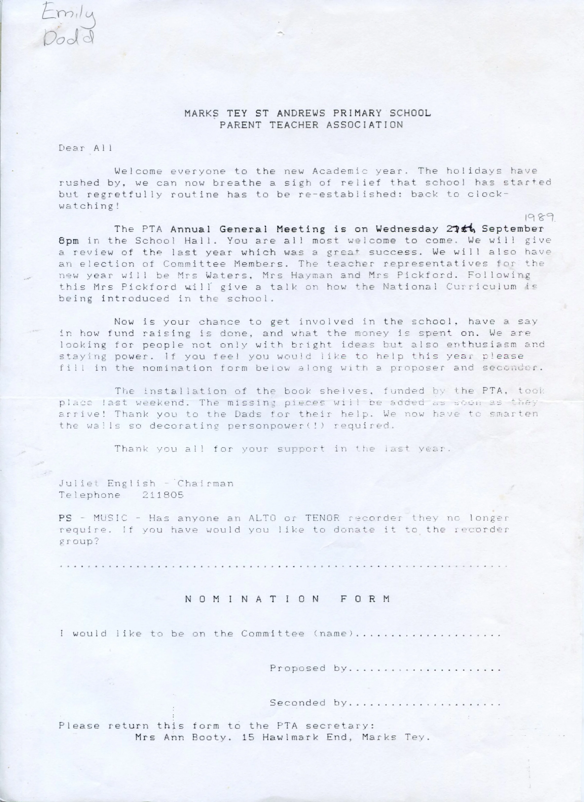 The letter is to the parents from St Andrews Primary School for Parent Teacher Association general annual meeting.