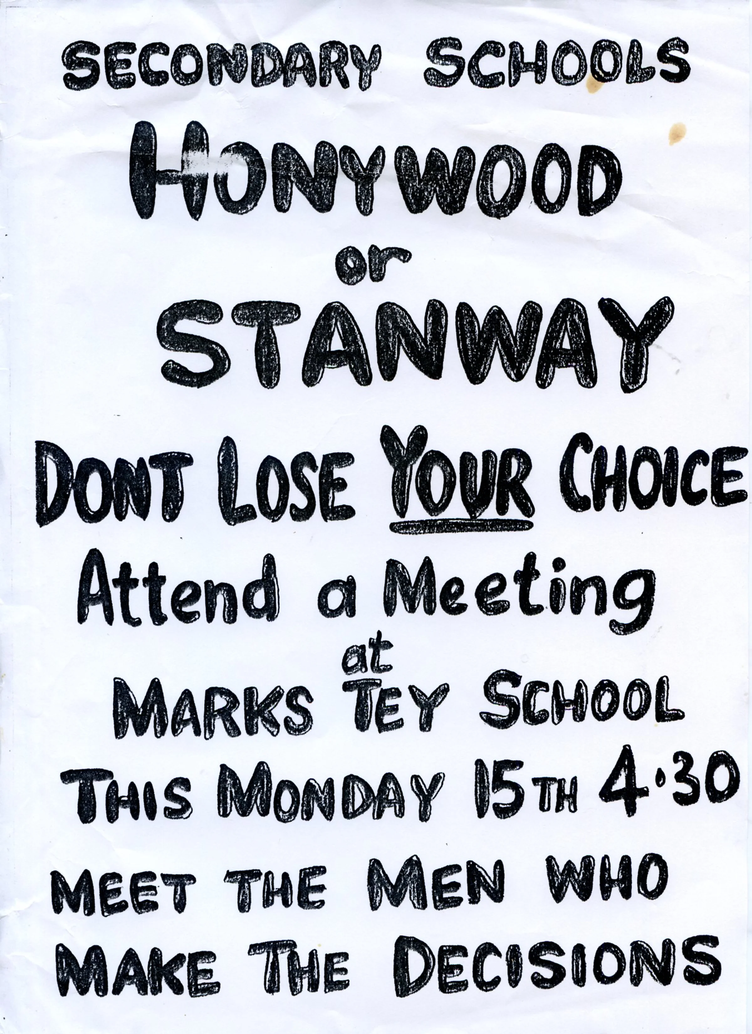 An illustrative letter in a poster format sent off to the parents of the pupils of Marks Tey school for an upcoming meeting.
